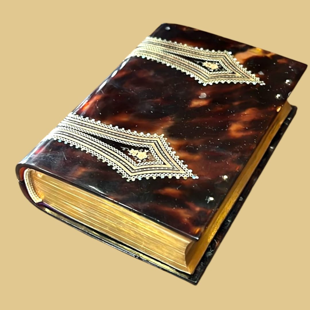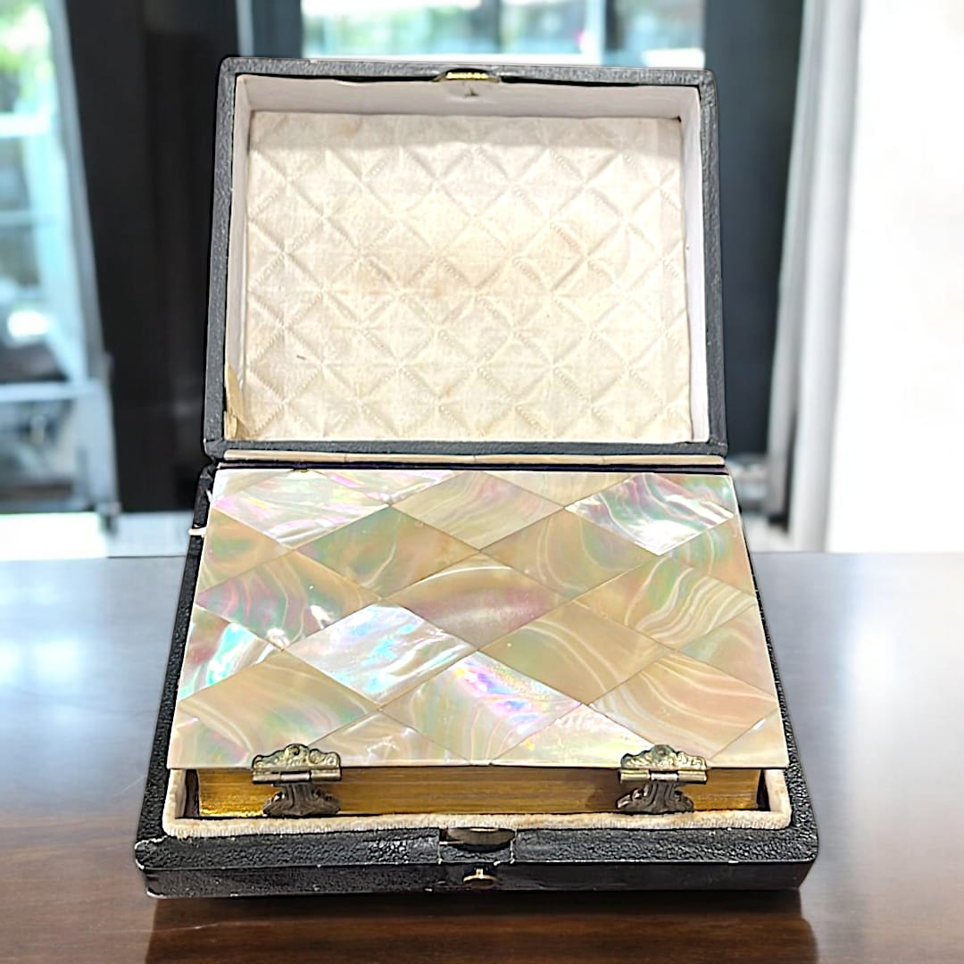 Libro Primera Comunión nácar ilustrado con imagen religiosa en portada, pieza decorativa única para colecciones espirituales.