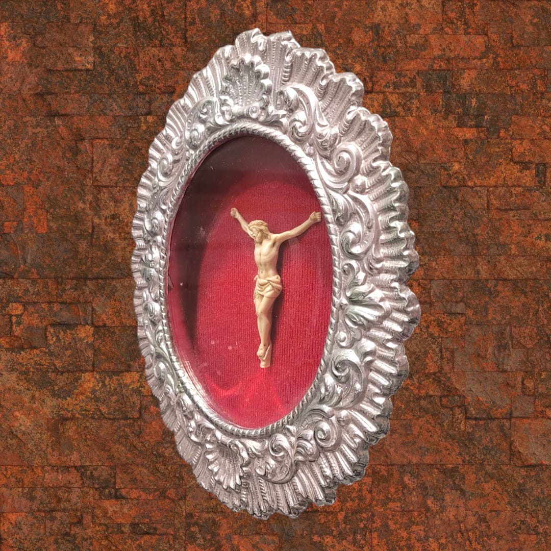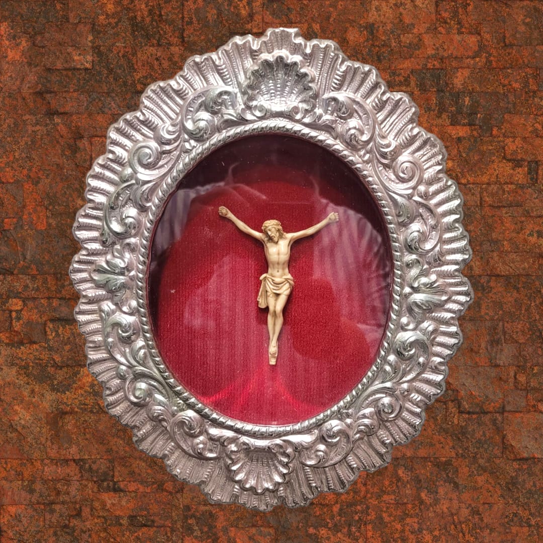 Relicario Cristo del Gran Poder en plata de ley sobre fondo burdeos.