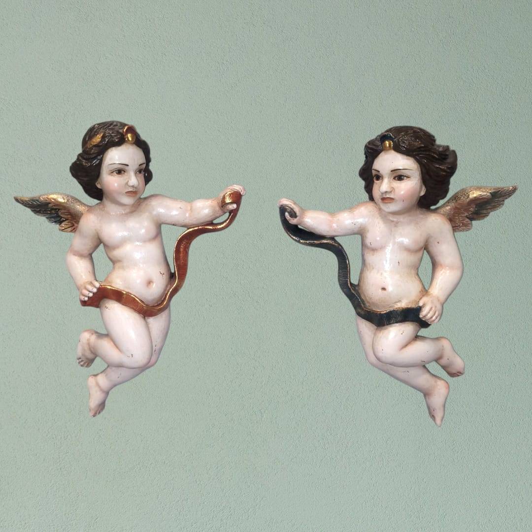 Medallas de metal fundido con relieves religiosos únicos, Virgen con Niño Jesús y Ángel de la Guarda con niña, sobre fondo decorado con flores rosadas.