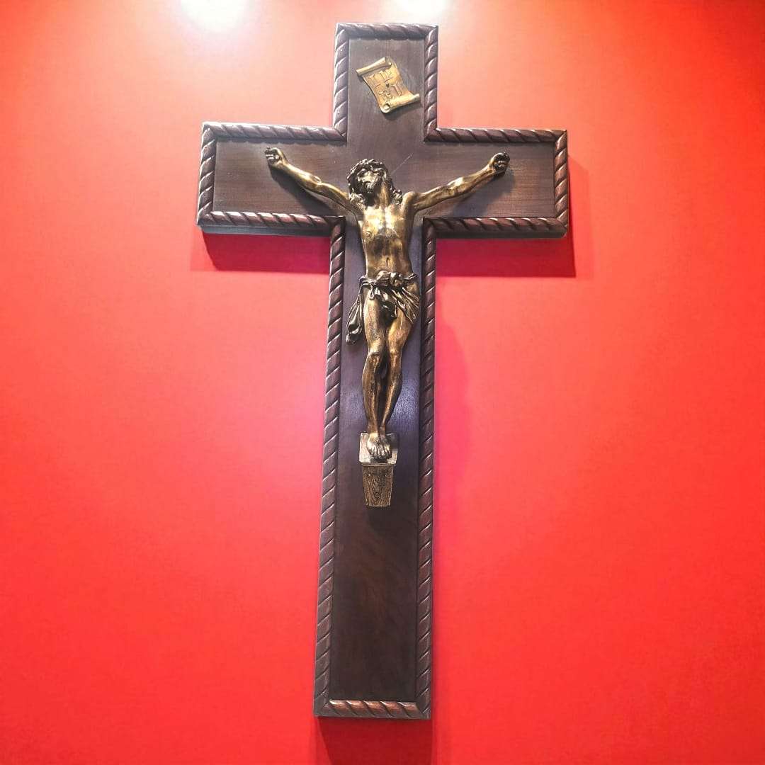 Vista frontal del Crucifijo cruz de madera con Cristo en metal, destacando su diseño simétrico y detallado.