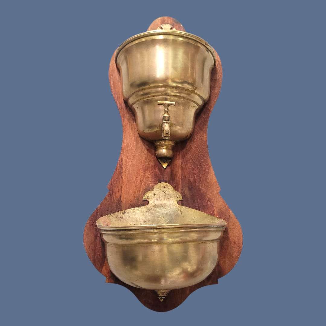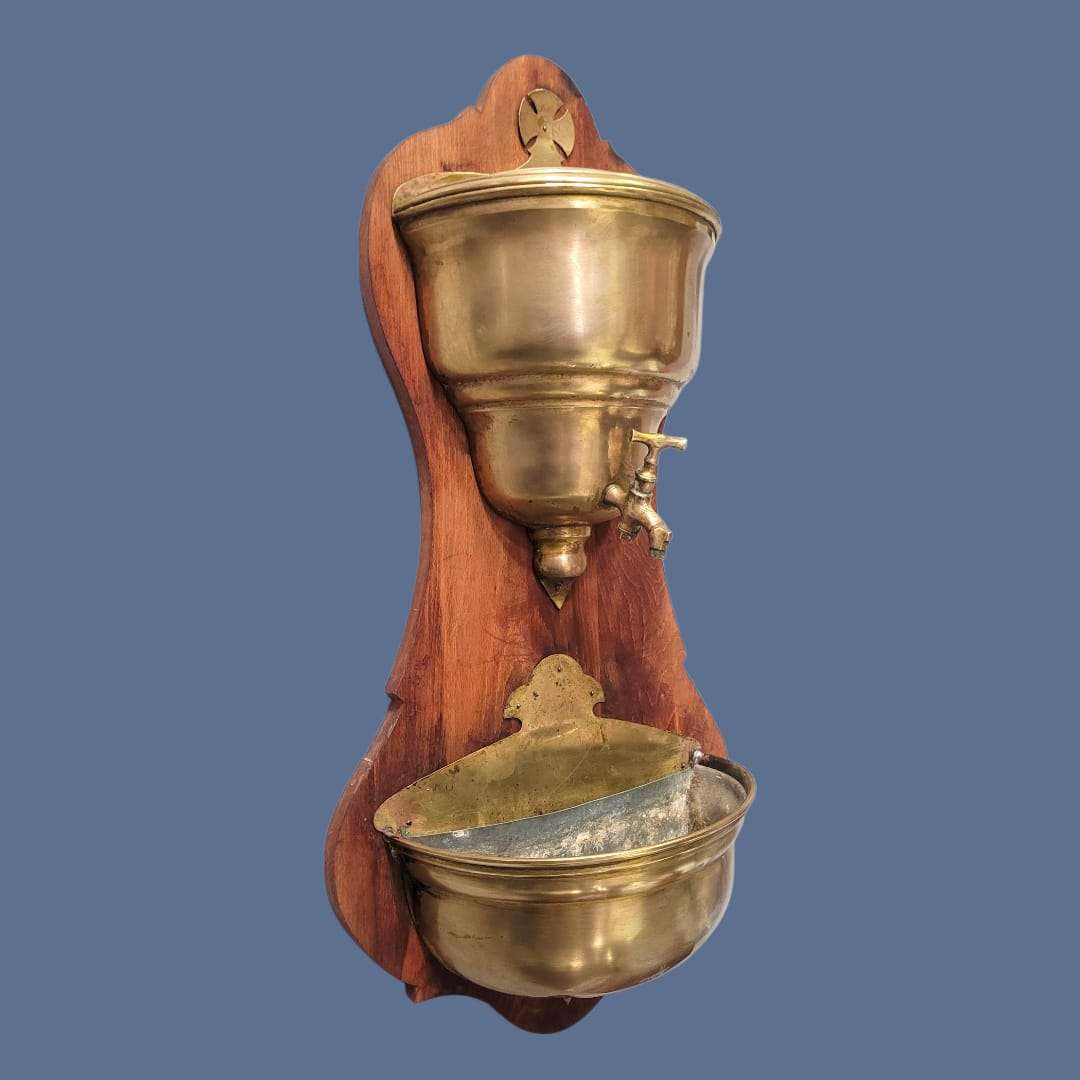 Fuente de sacristía antigua completa, vista lateral con grifo.