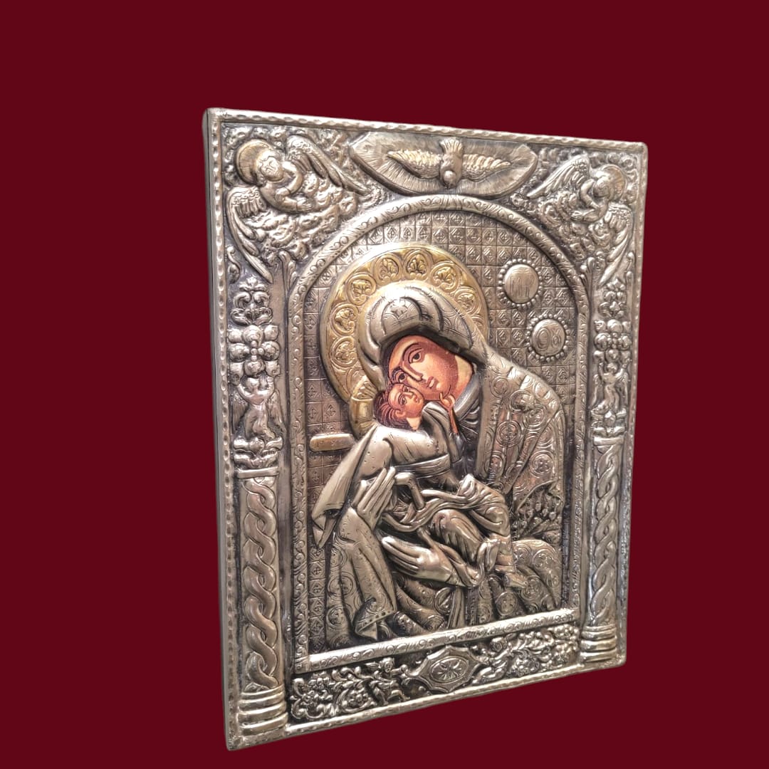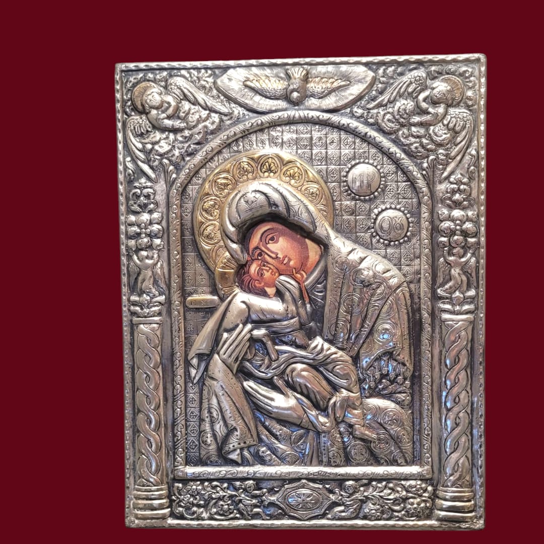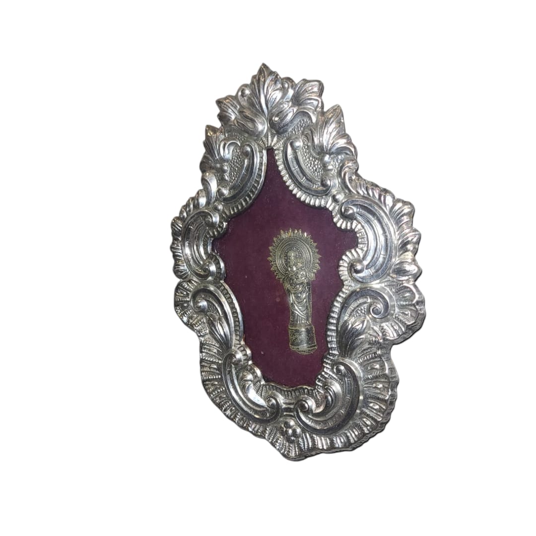 Relicario Virgen con Niño en marco plateado con fondo burdeos, arte sacro único ideal para altar religioso o colección devocional.