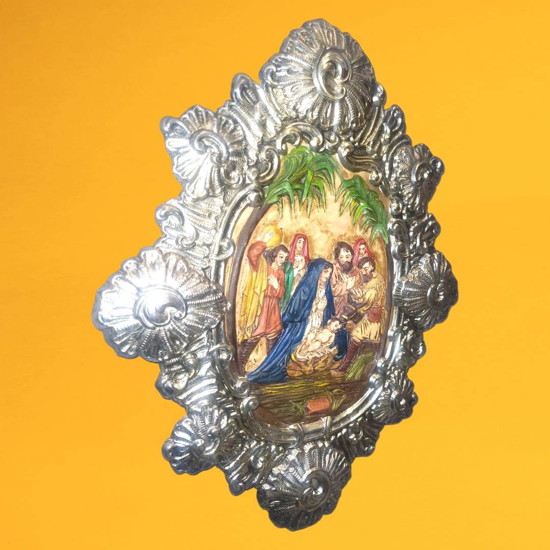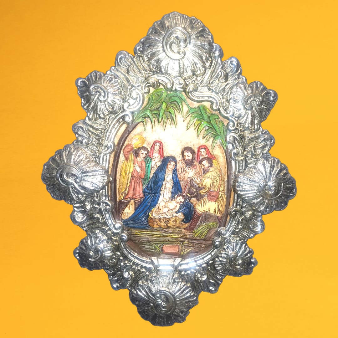 Su interior, protegido por cristal, guarda una escena minuciosamente labrada en plata, representando el Nacimiento de Cristo: la Virgen María, San José, el Niño Jesús en el pesebre y figuras angelicales que lo envuelven en una atmósfera celestial.