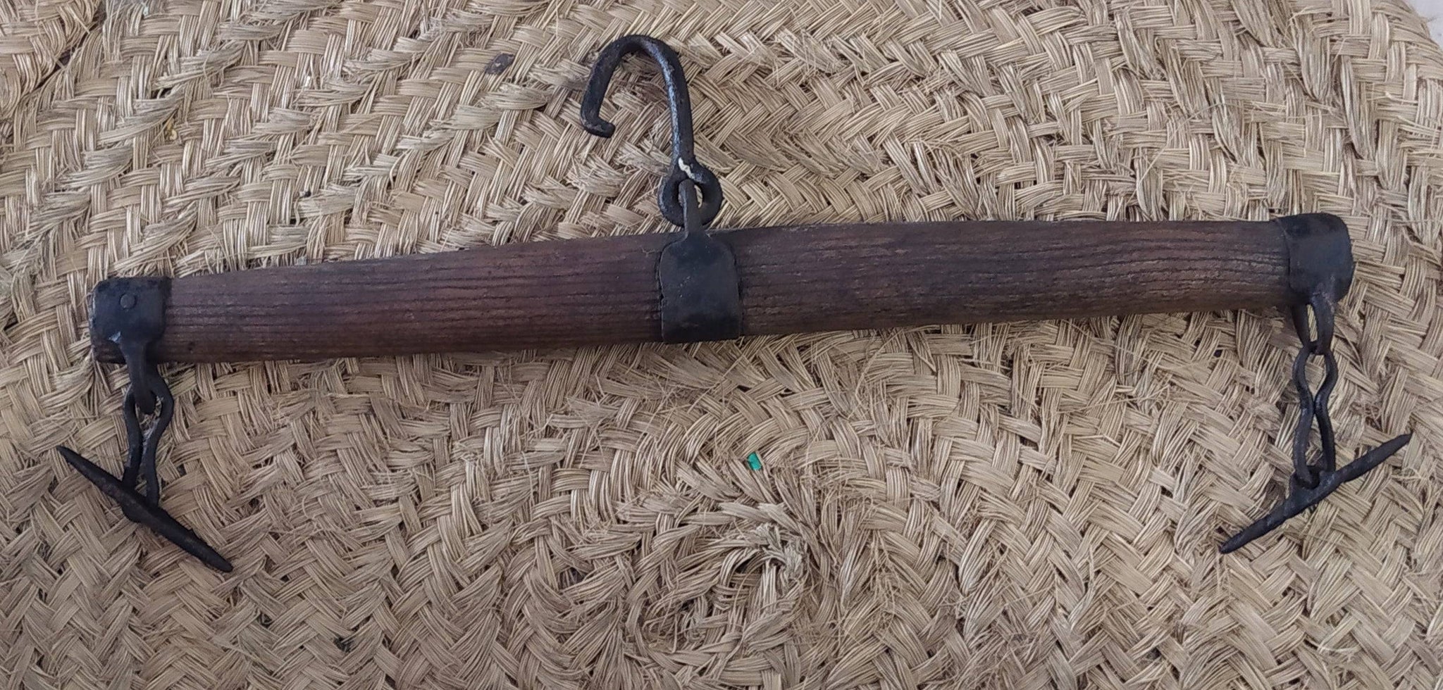 Balancín de madera dura para tiro animal con gancho central y extremos metálicos, ideal para mulas y caballos en decoración rústica.