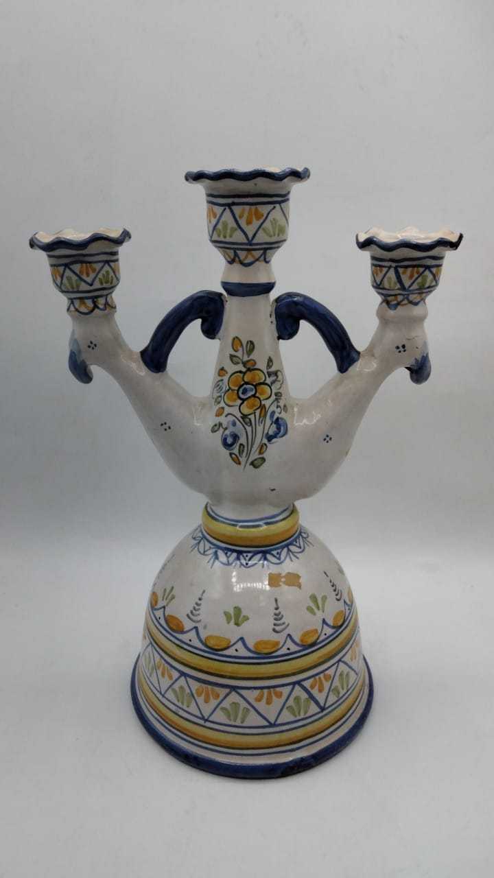 Este candelabro de cerámica de Talavera pintado a mano es una pieza única que conjuga belleza artesanal, historia y funcionalidad. Con tres brazos estilizados, colores intensos y trazos cuidadosamente aplicados, representa la tradición viva de la alfarería de Talavera de la Reina.