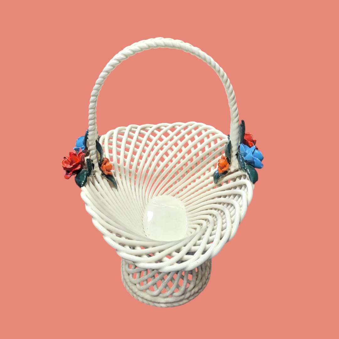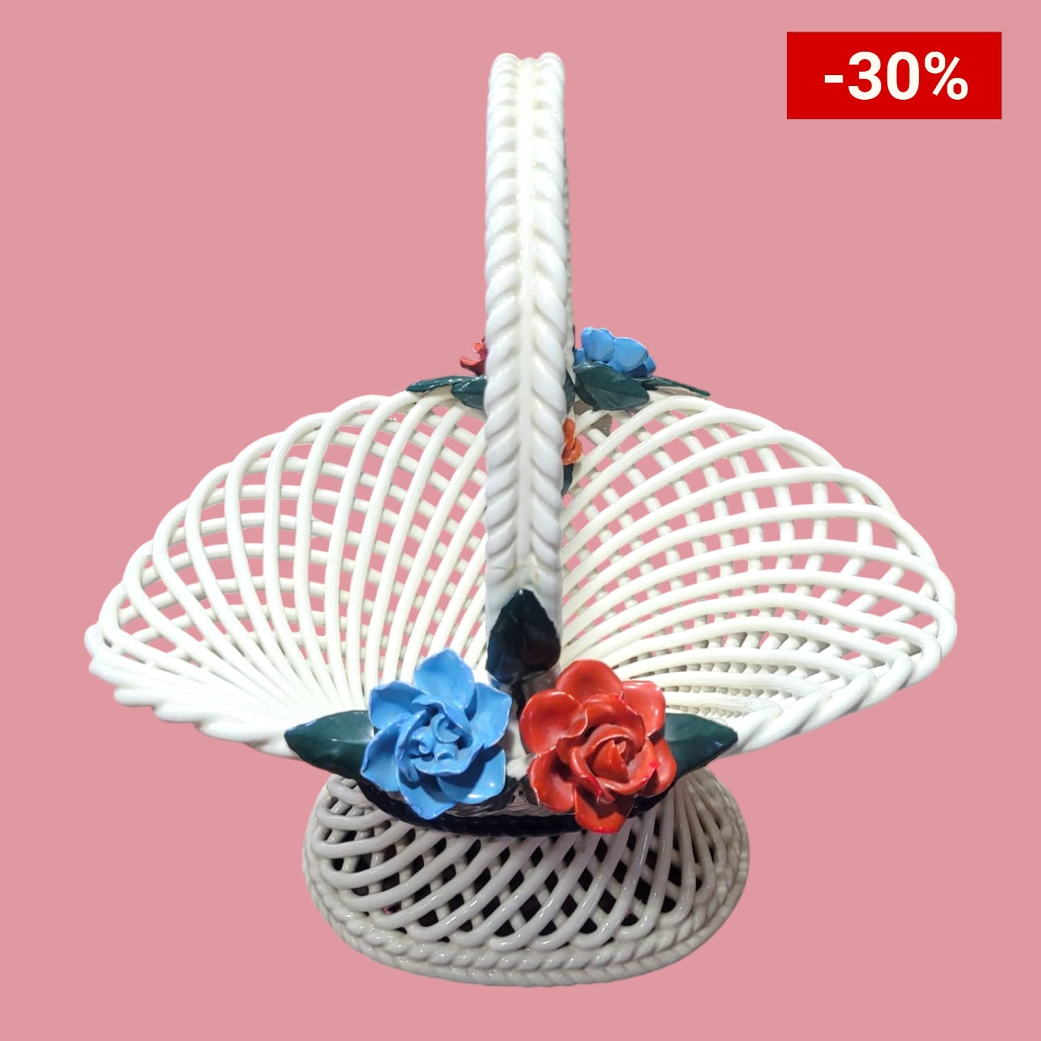 Esta hermosa cesta de Manises destaca por su delicado trabajo en cerámica con un trenzado fino y flores pintadas a mano. Un diseño exquisito que combina tradición y elegancia en una sola pieza.