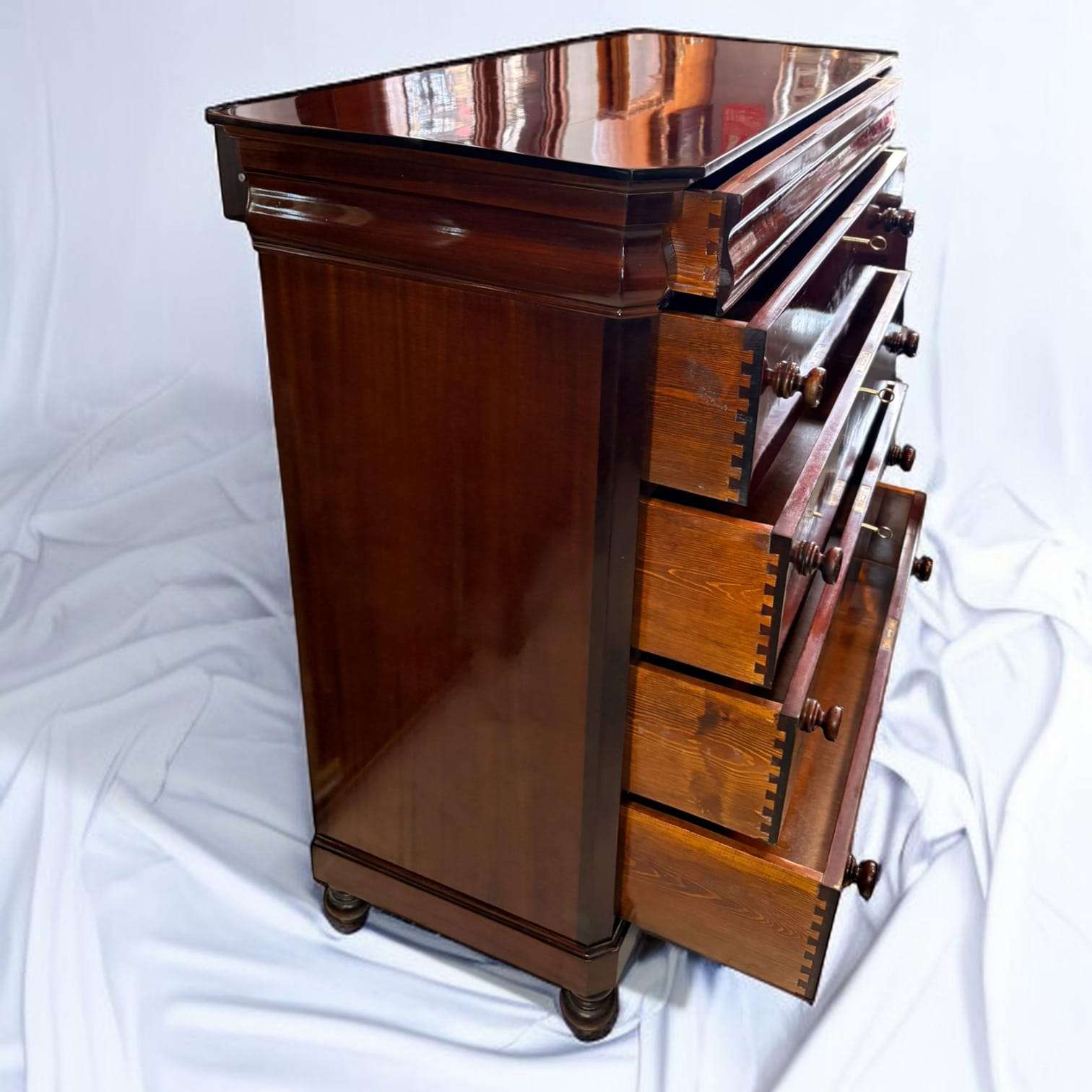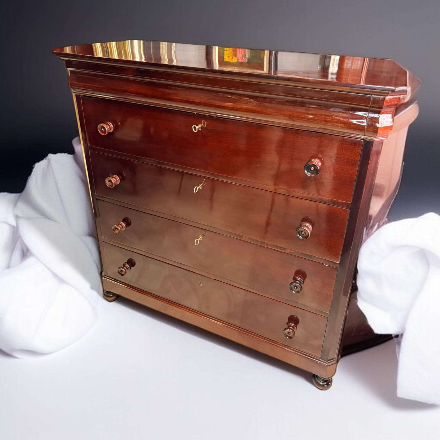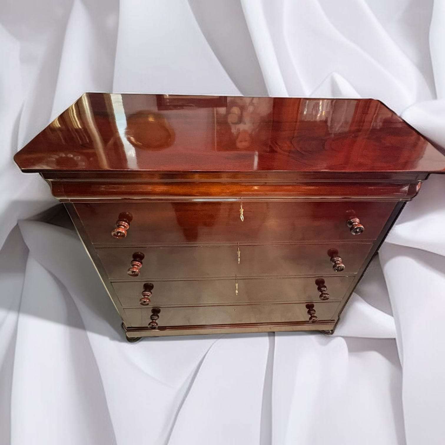 En las imágenes se aprecia un mueble de líneas sobrias y muy refinadas, con cuatro cajones frontales de gran formato, tablero superior amplio con esquinas delanteras achaflanadas, y una moldura superior voluminosa que realza toda la silueta. Los pomos torneados de madera y las cerraduras visibles refuerzan su carácter clásico, mientras que el brillo de la caoba aporta profundidad, calidez y una lectura visual muy noble. Esta Cómoda destaca también por sus laterales limpios, su base discreta elevada sobre pequeños apoyos redondeados y la armonía general de un diseño elegante y atemporal.