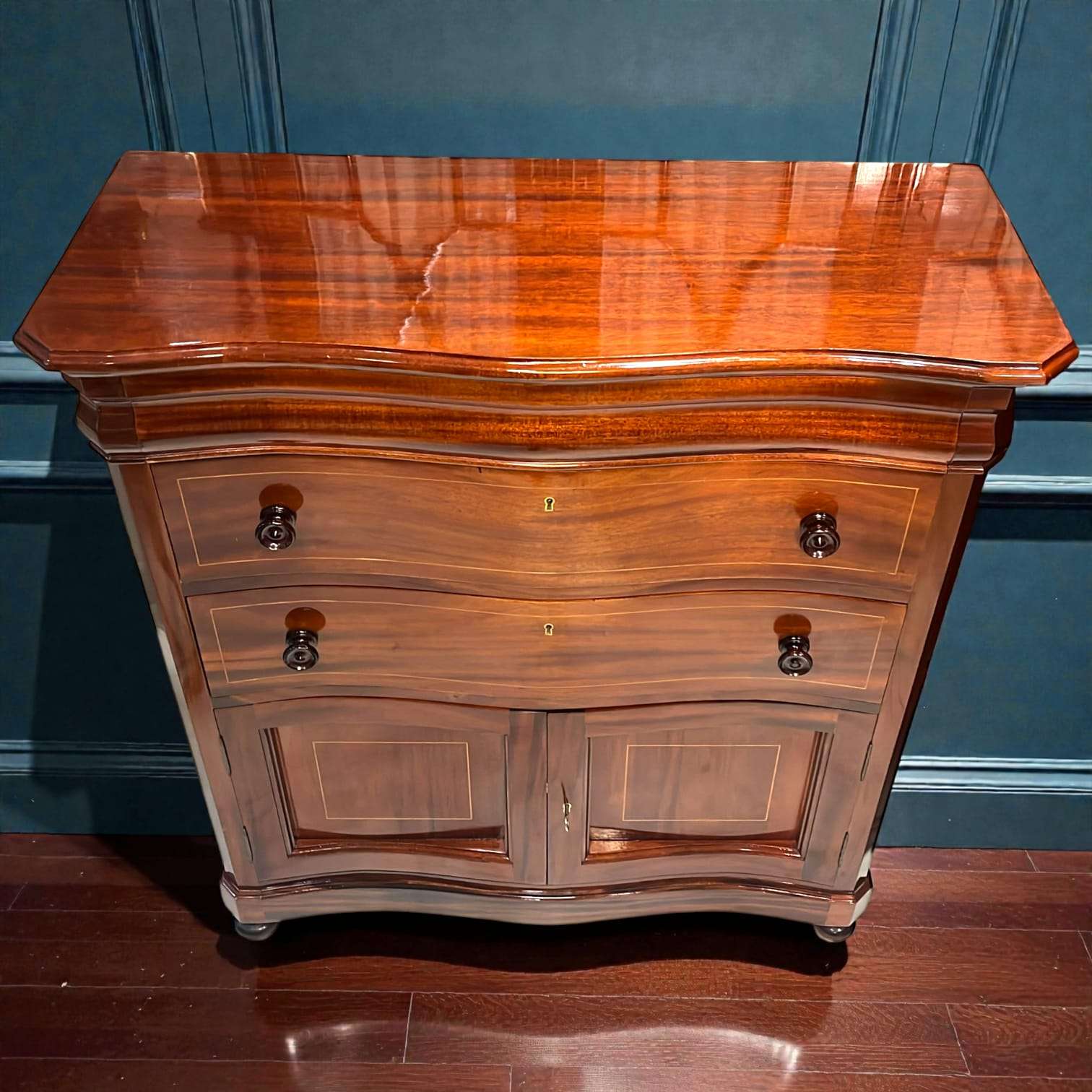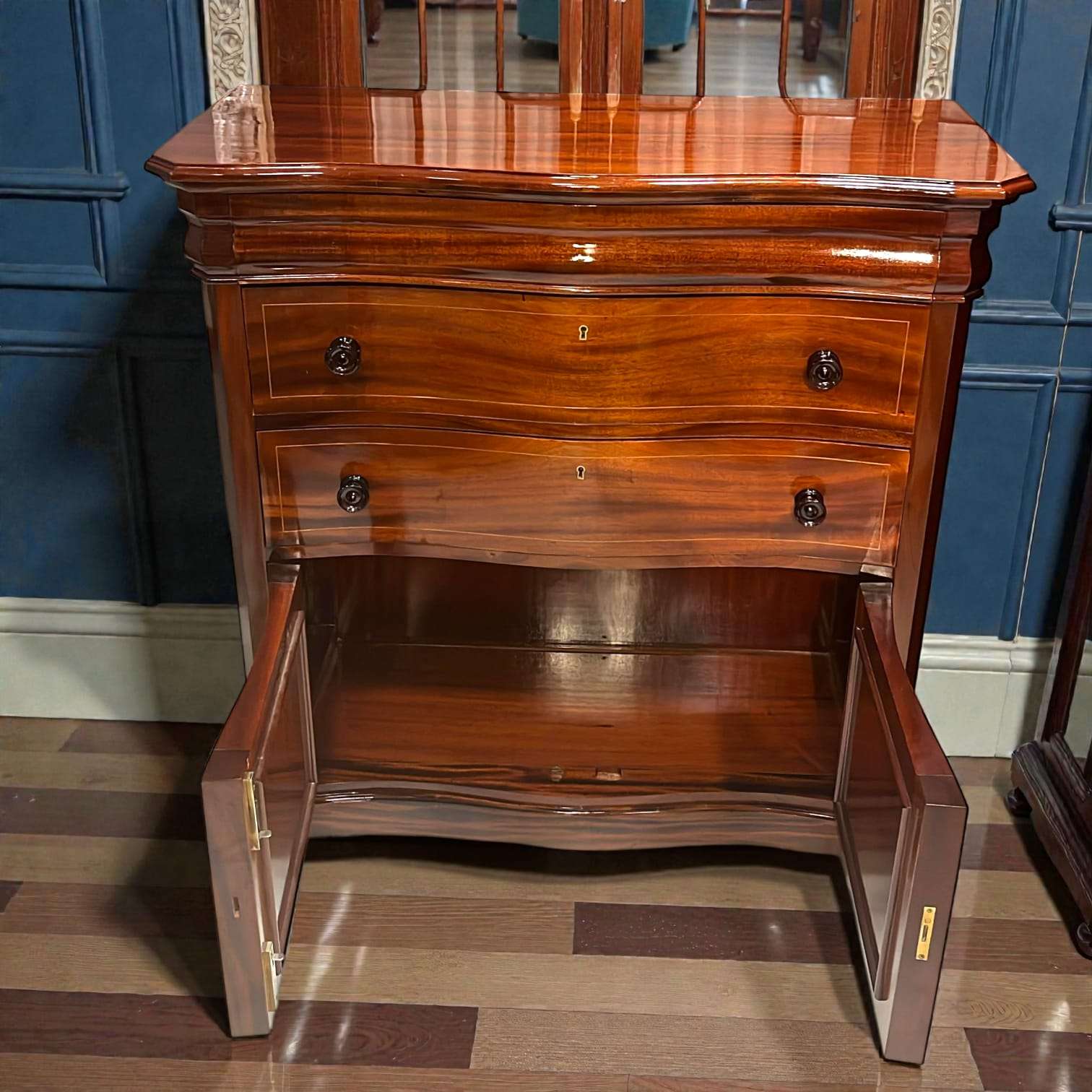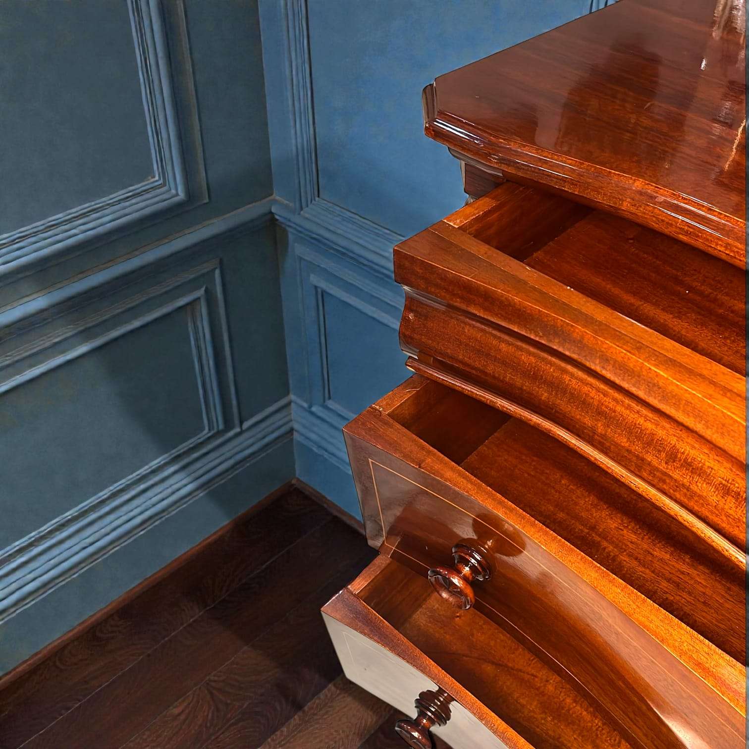 Lo primero que destaca es su tapa superior de caoba maciza con acabado alto brillo, donde la veta natural crea un efecto espejo profundo y cálido. El frente presenta cajones con curvatura ondulada, un detalle poco habitual que aporta dinamismo visual y elegancia refinada.