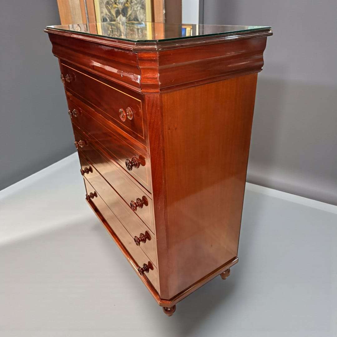 No es un mueble moderno producido en serie. Es una pieza con presencia, pensada para durar generaciones. Esta Cómoda Escritorio de Caoba con Tapa de Cristal representa la elegancia clásica en su máxima expresión.