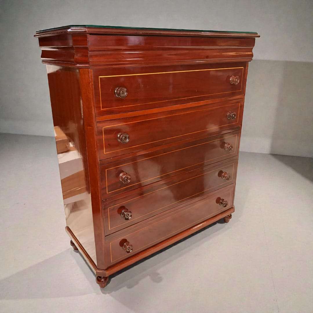La Cómoda Escritorio de Caoba con Tapa de Cristal es una pieza clásica que combina elegancia, funcionalidad y presencia. No es solo una cómoda tradicional: es también un escritorio oculto, diseñado para quienes valoran el orden, el estilo inglés y la nobleza de la madera maciza.