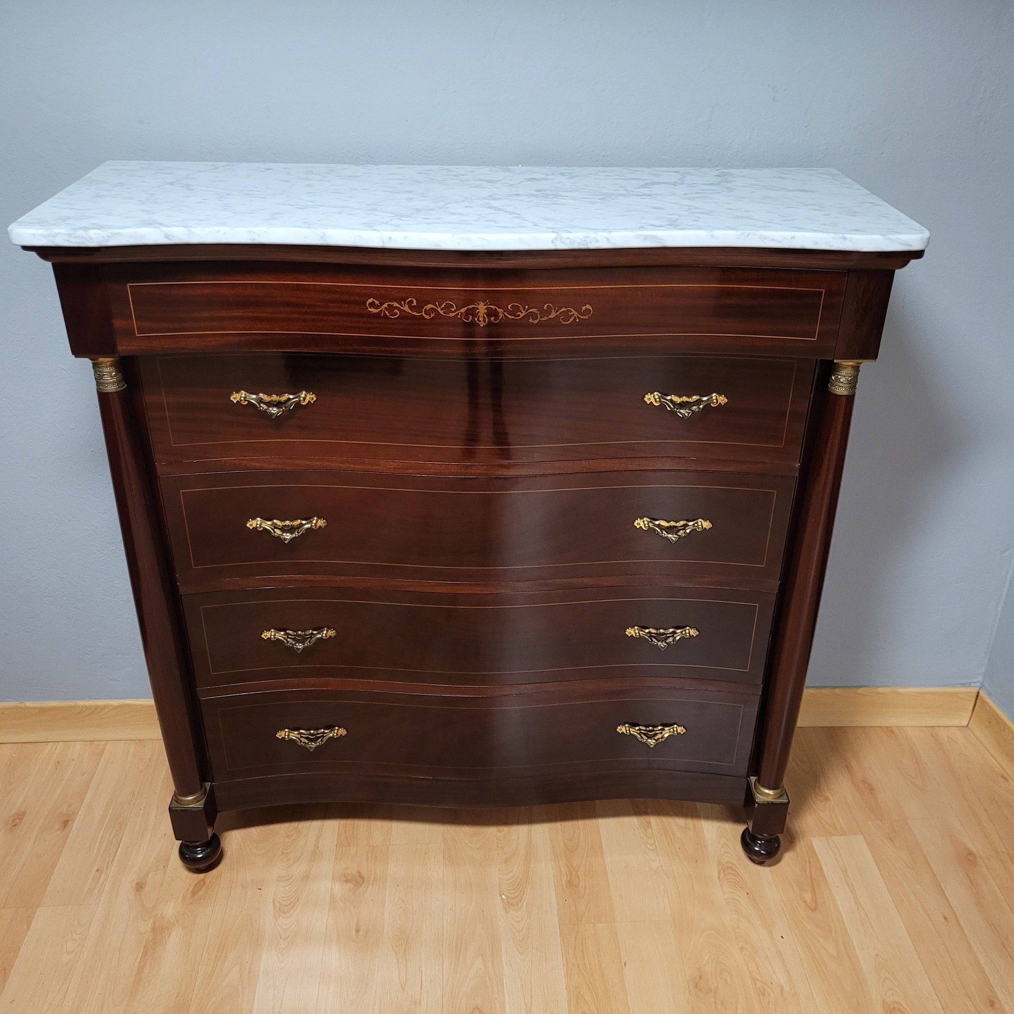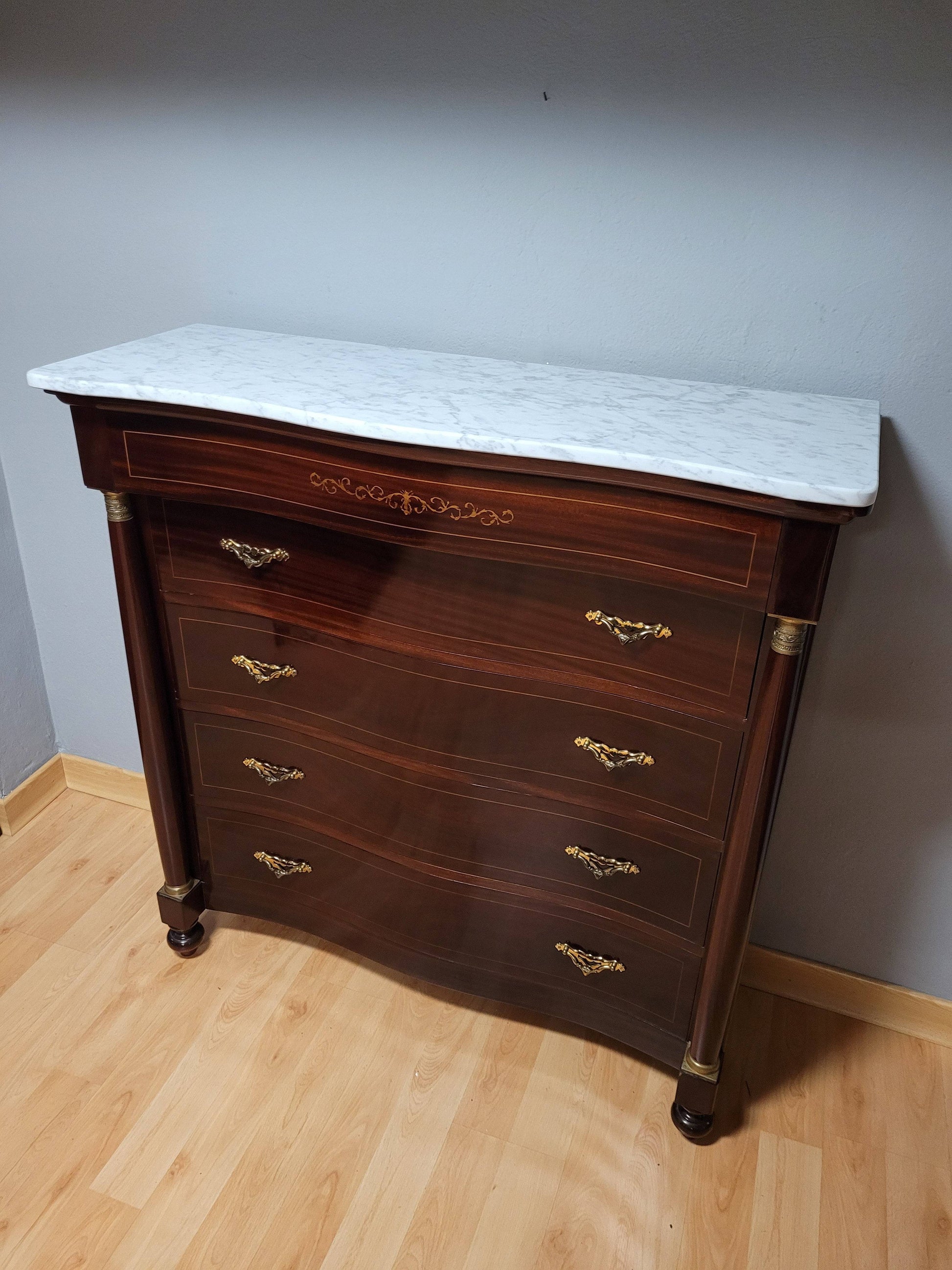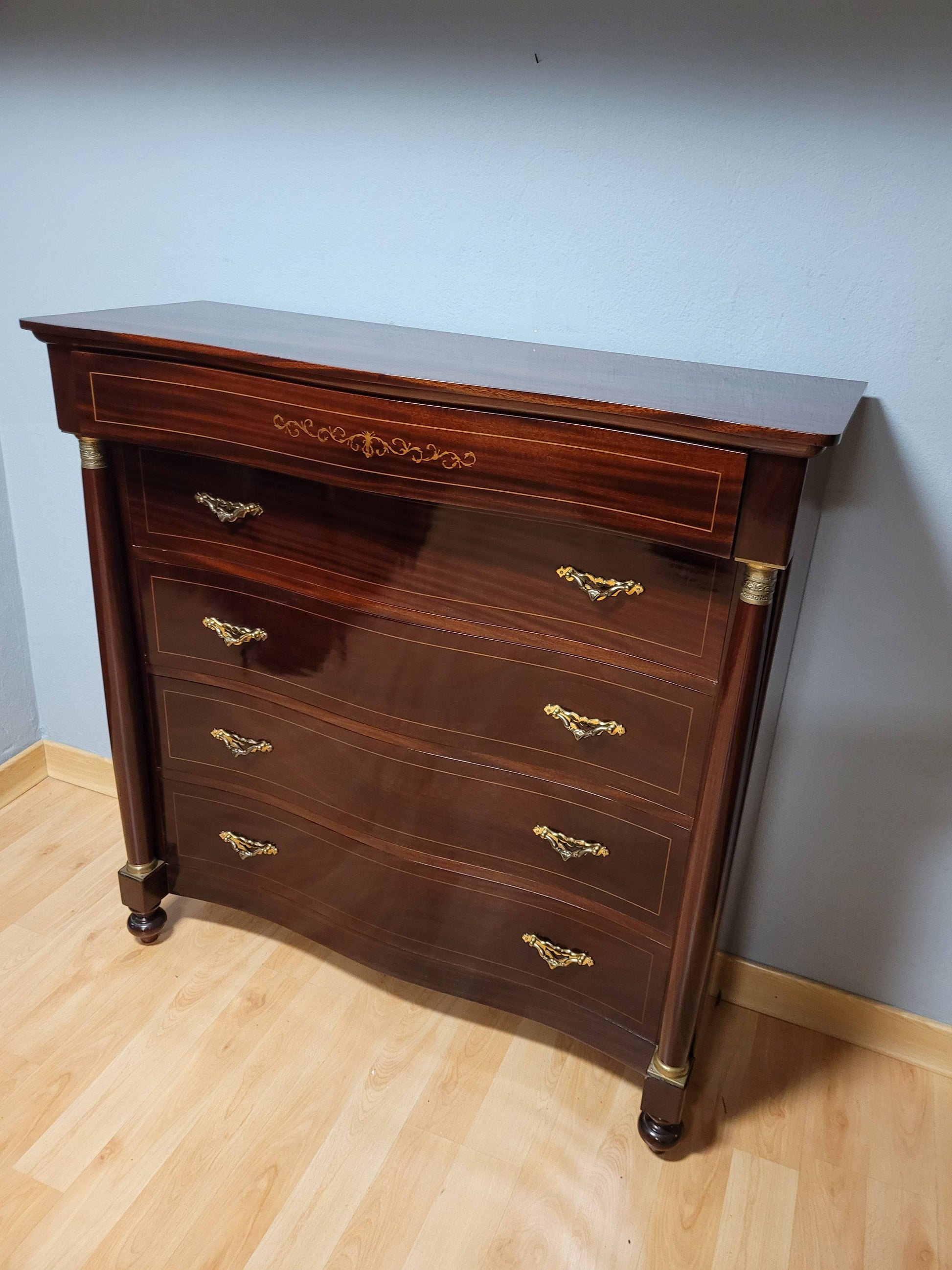 Esta elegante cómoda estilo Imperio fabricada en madera de caoba es un ejemplo de lujo y sofisticación clásica. Destaca por su impecable estado de conservación, prácticamente nueva, ideal para aportar distinción y estilo a cualquier espacio de tu hogar.