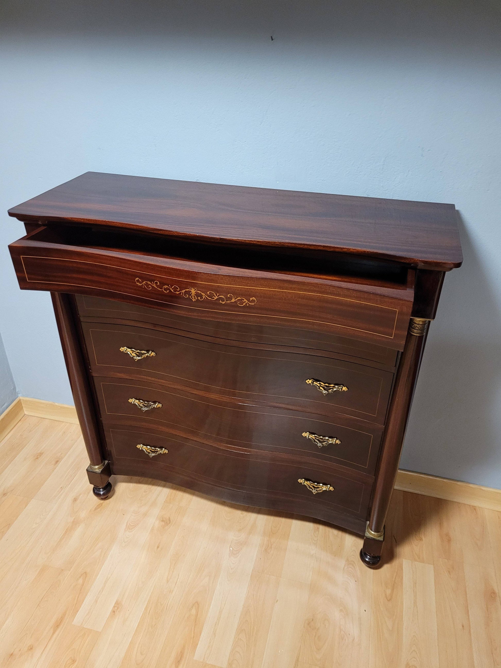Añade elegancia y funcionalidad a tu espacio con esta cómoda Imperio de madera de caoba, una pieza excepcional que combina estilo clásico y practicidad.