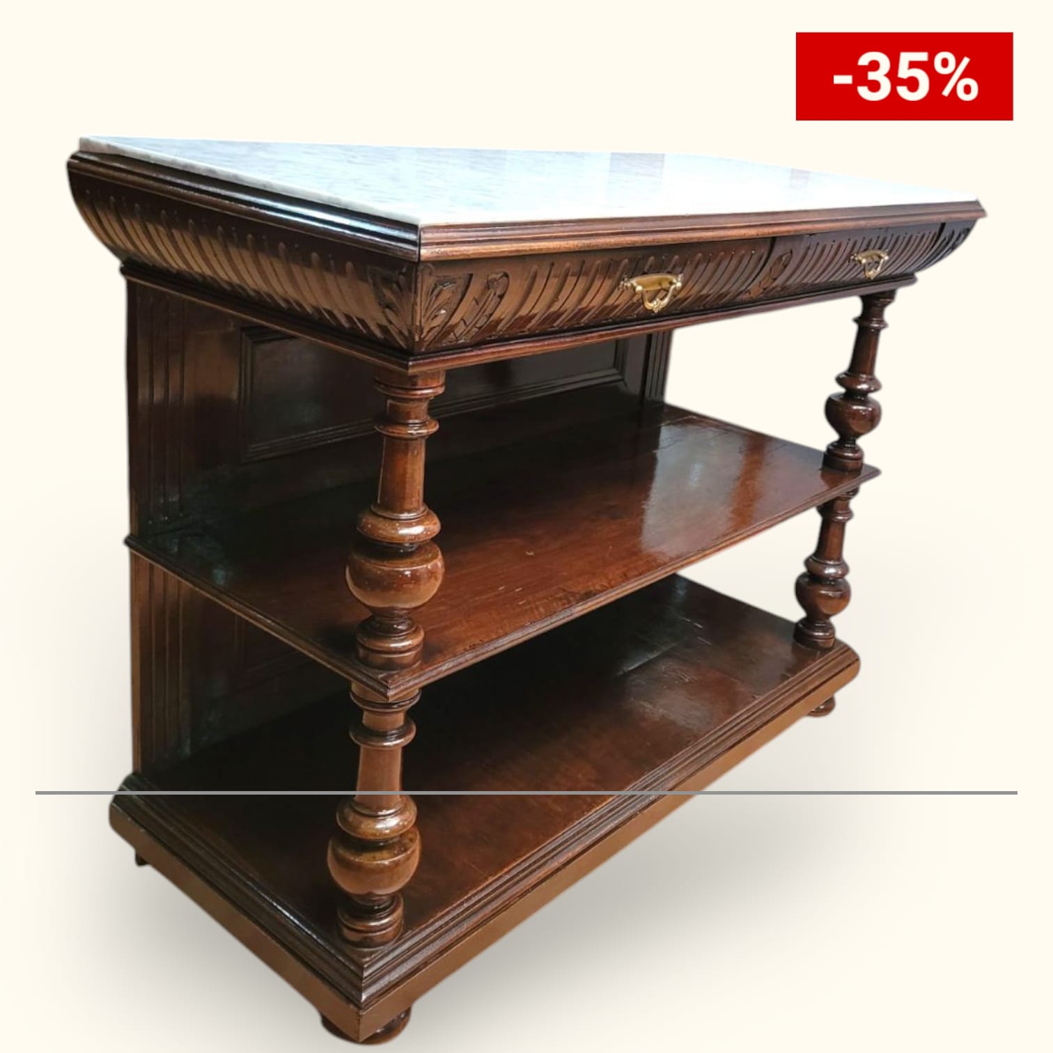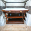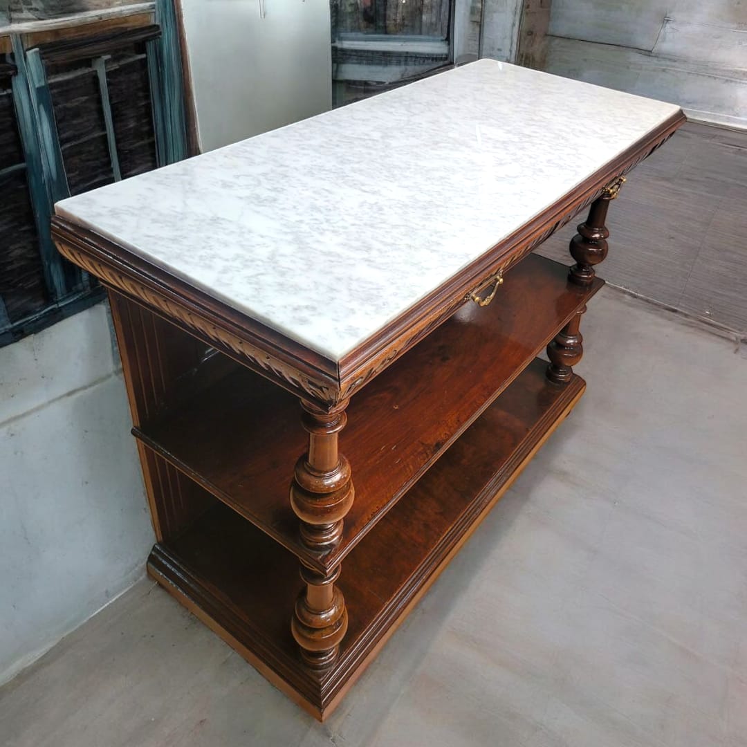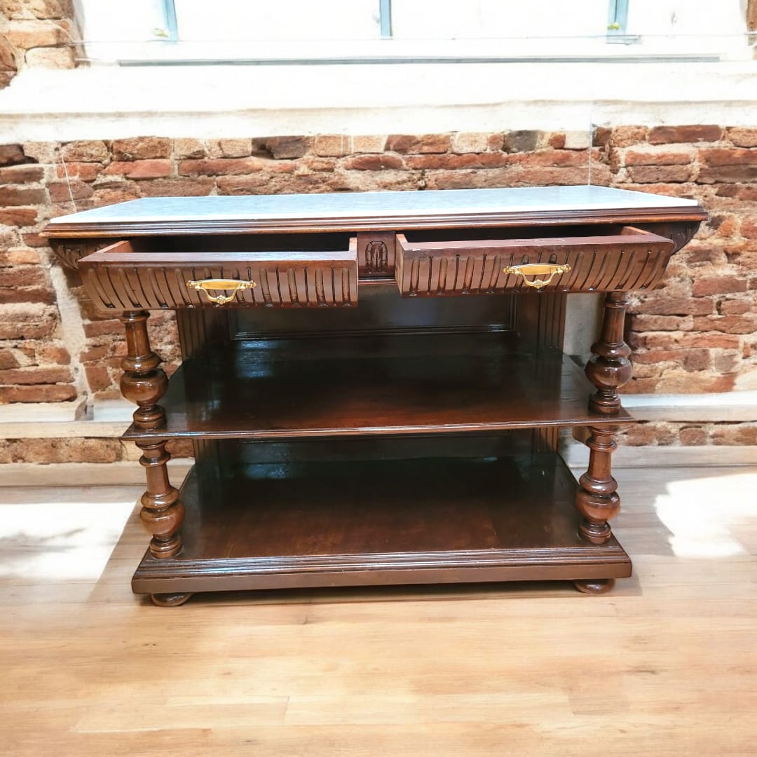 Esta Consola madera tallada antigua con tapa de mármol es una joya de la carpintería clásica. Su robusta estructura de madera maciza tallada a mano, junto a la nobleza de su tapa de mármol blanco veteado, convierte a esta pieza en una opción perfecta para quienes buscan autenticidad y distinción.