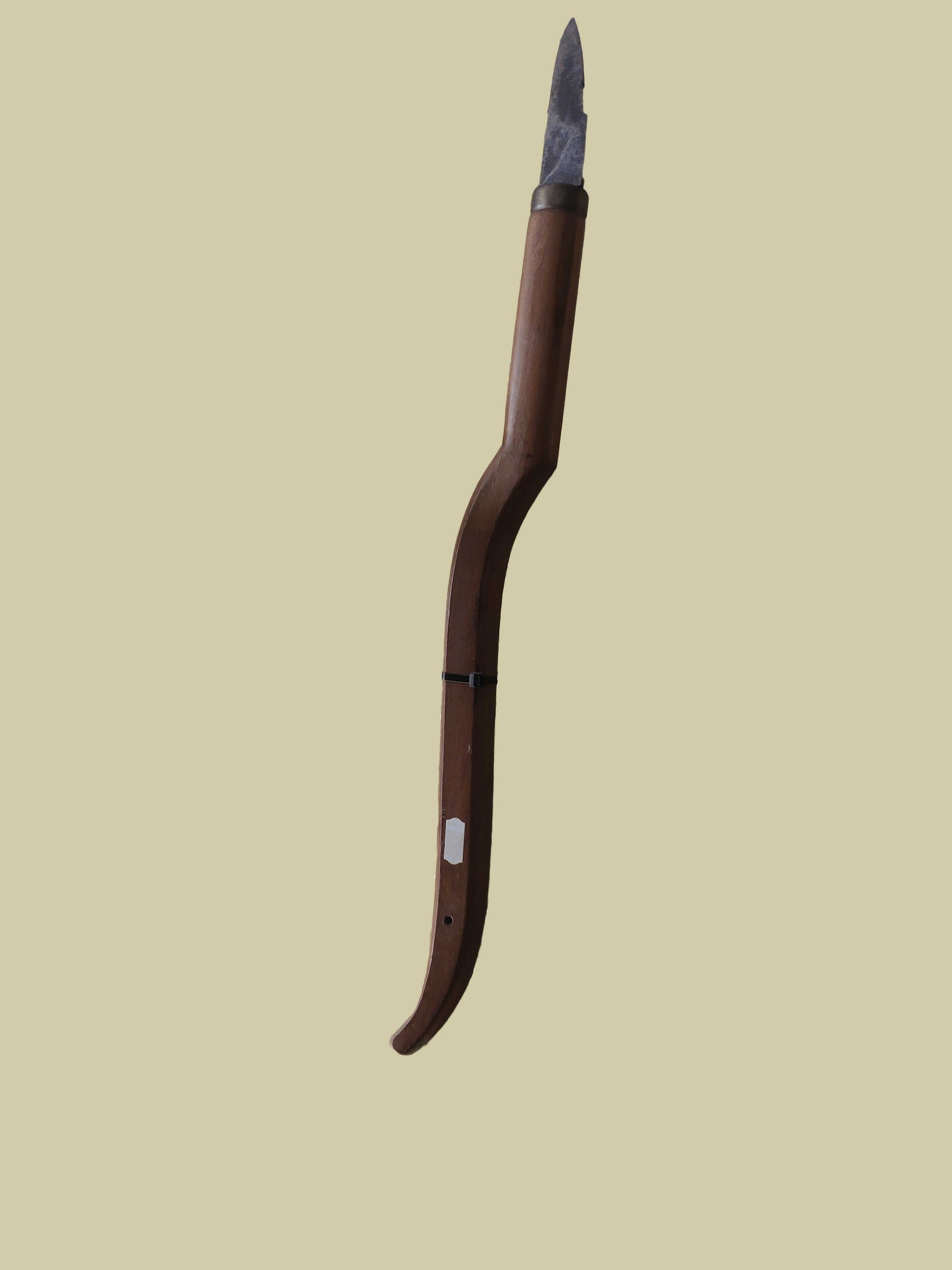 La Cortadora de Pescado de Madera y Acero de Cositas Antiguas es una herramienta artesanal diseñada para facilitar el corte de pescados grandes con precisión y seguridad.