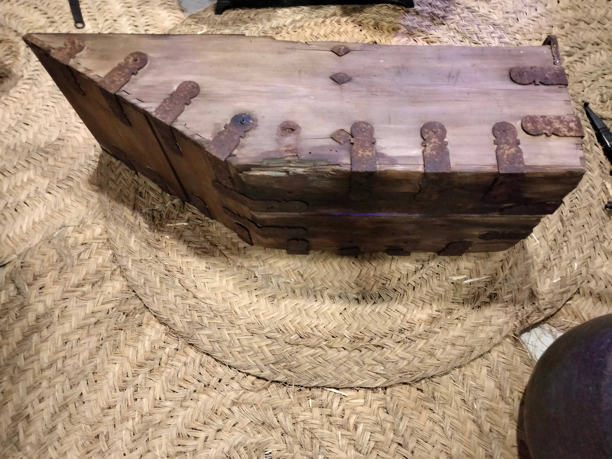 Material original: Fabricada en madera sólida envejecida con herrajes metálicos remachados.