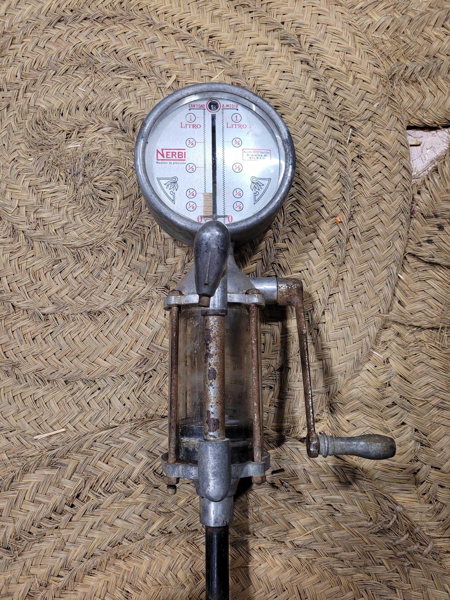 Este dispensador de aceite antiguo de los años 40-50 es una joya mecánica y visual del comercio tradicional español. Con 140 cm de altura, es una pieza robusta y auténtica, conservada en perfectas condiciones y lista para destacar en cualquier ambiente vintage o industrial.