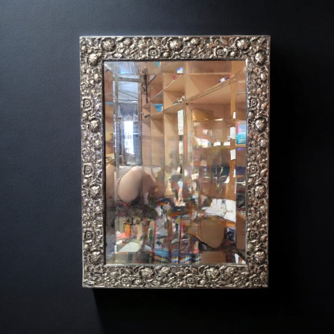 Descubre este espectacular espejo de cristal biselado con marco en relieve de metal plateado, una pieza única que aporta sofisticación y carácter a cualquier ambiente. El marco presenta un delicado trabajo de relieve floral en todo su perímetro, lo que le confiere un aire distinguido y clásico que se adapta perfectamente a decoraciones vintage, románticas o incluso eclécticas.