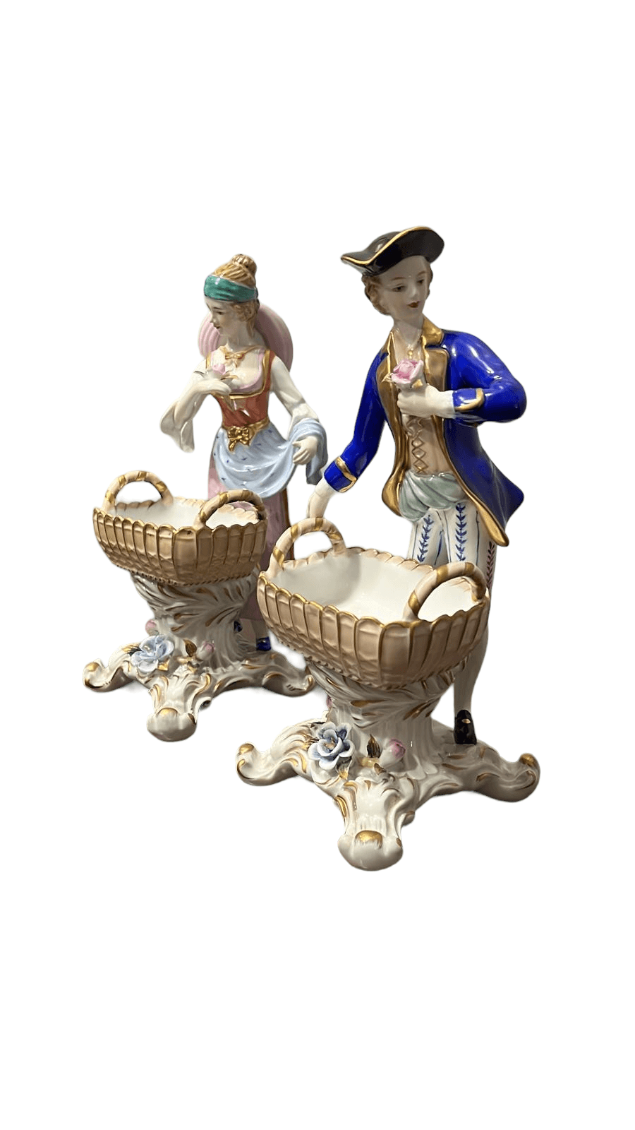 Esta exquisita pareja de figuras de porcelana francesa , elaborada por la prestigiosa firma Sèvres , captura la elegancia y el refinamiento del siglo XVIII. Representando a un hombre y una mujer portando canastas, estas piezas son un testimonio del compromiso de Sèvres con la artesanía excepcional y la tradición artística.