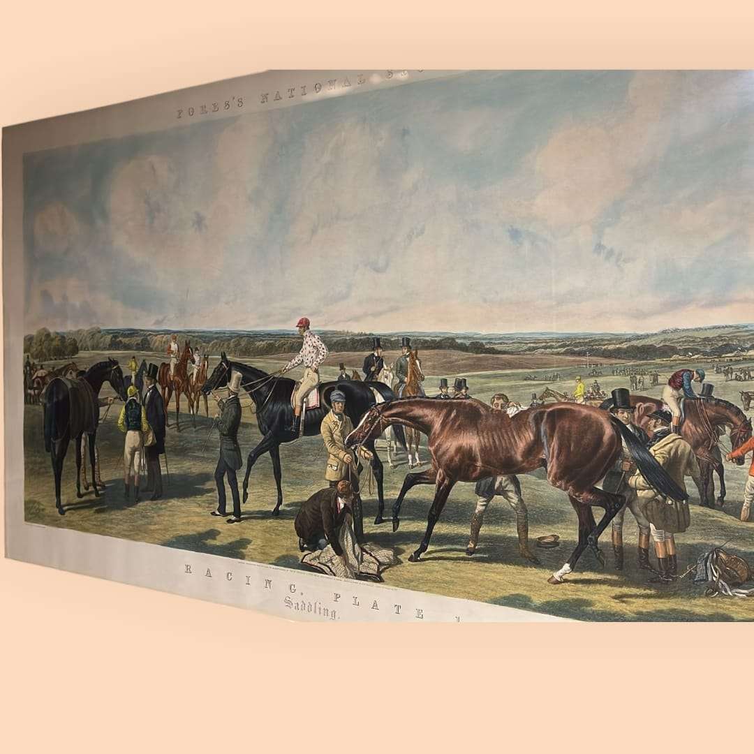 Serie / título visible en la estampa: “FORES’S NATIONAL SPORTS” y “RACING, PLATE I – Saddling” (texto en el margen).