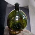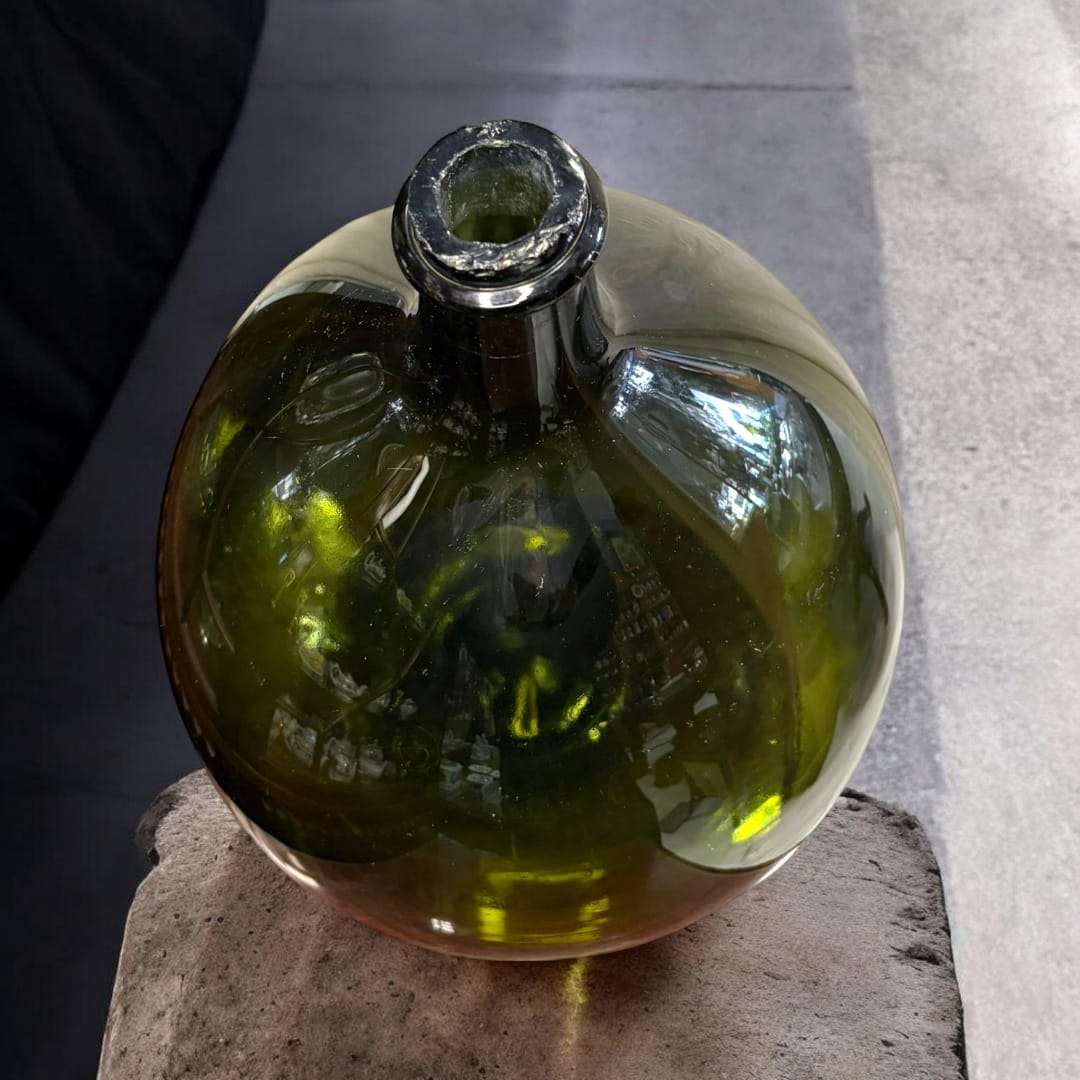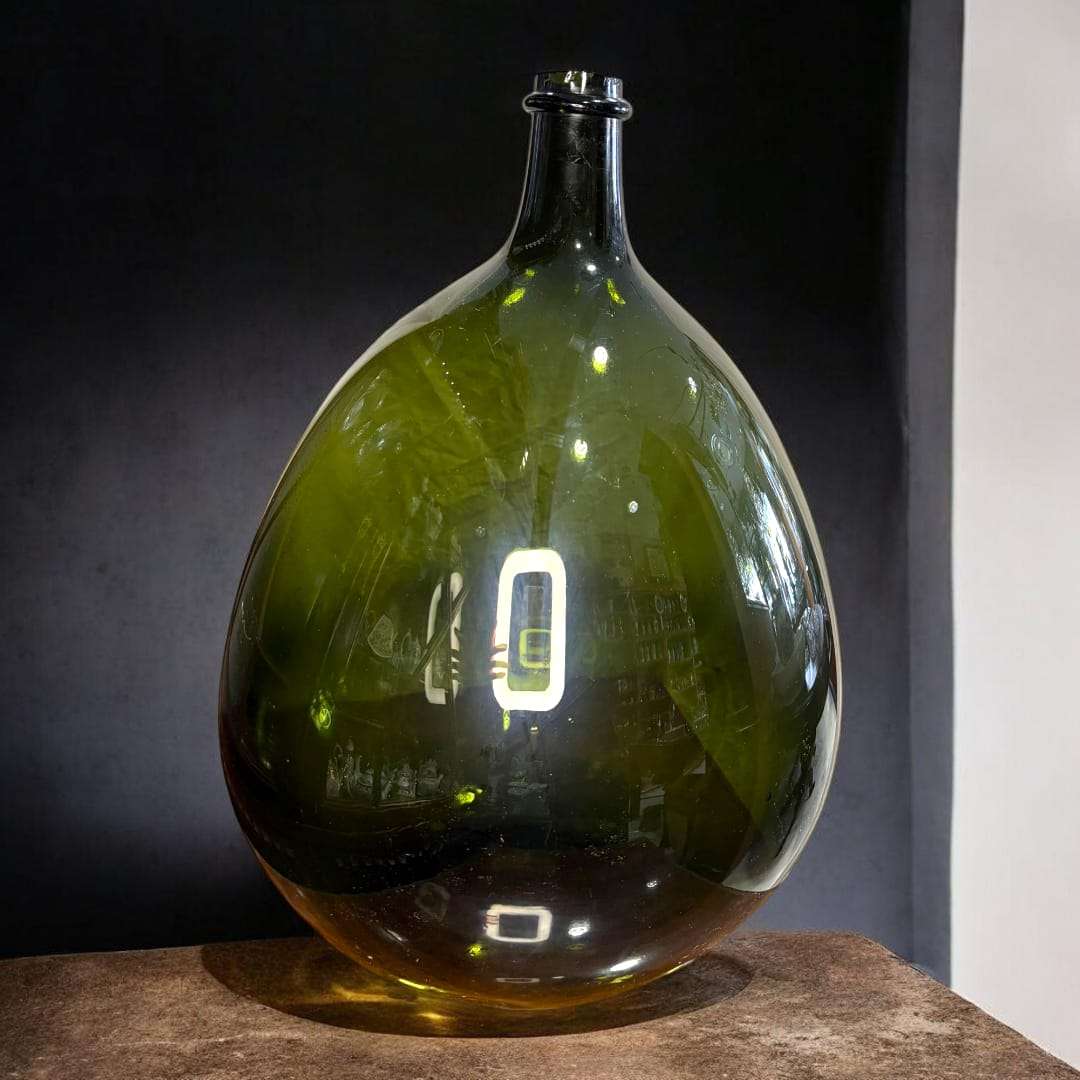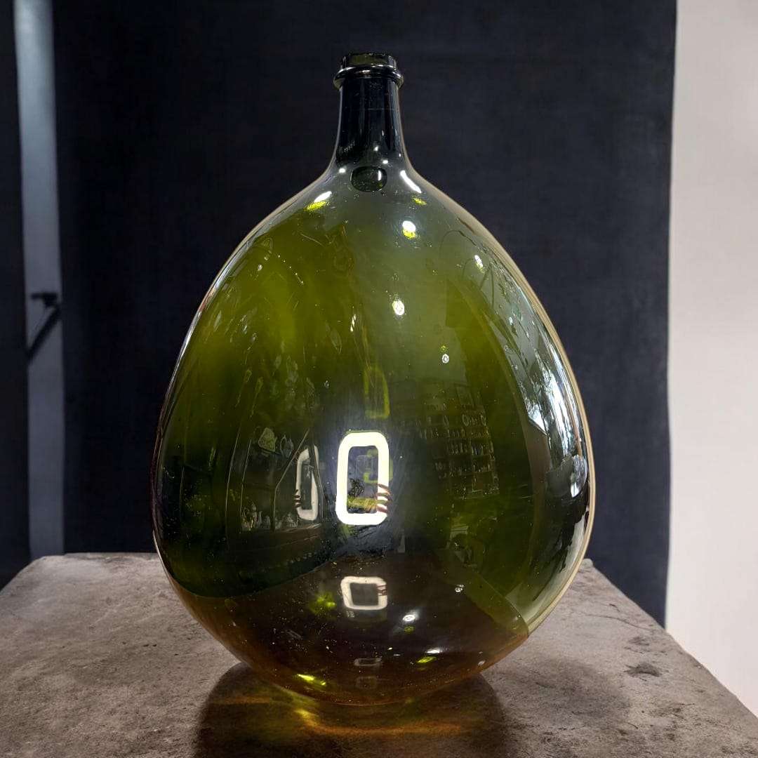 La transparencia del vidrio y sus matices verdes proyectan una luz cálida y natural. Esta Gran Damajuana no es solo un recipiente antiguo, es una declaración estética.