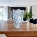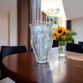 El jarrón de cristal tallado DARO con flor de plata de ley no es solo un jarrón, es una escultura funcional que juega con la luz, creando reflejos espectaculares gracias a su tallado profundo.