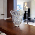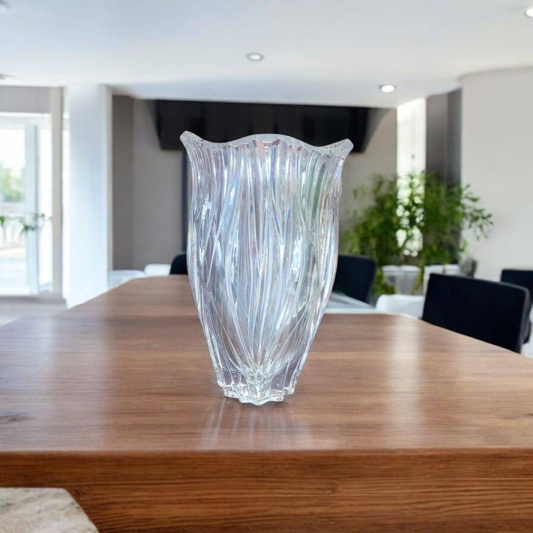 Este jarrón de cristal tallado DARO con flor de plata de ley es una verdadera obra de arte en vidrio, creada por los prestigiosos talleres de arte en cristal DARO. Su diseño elegante y robusto, con paredes gruesas y formas onduladas, lo convierte en una pieza decorativa de lujo, ideal para centros de mesa o vitrinas exclusivas.