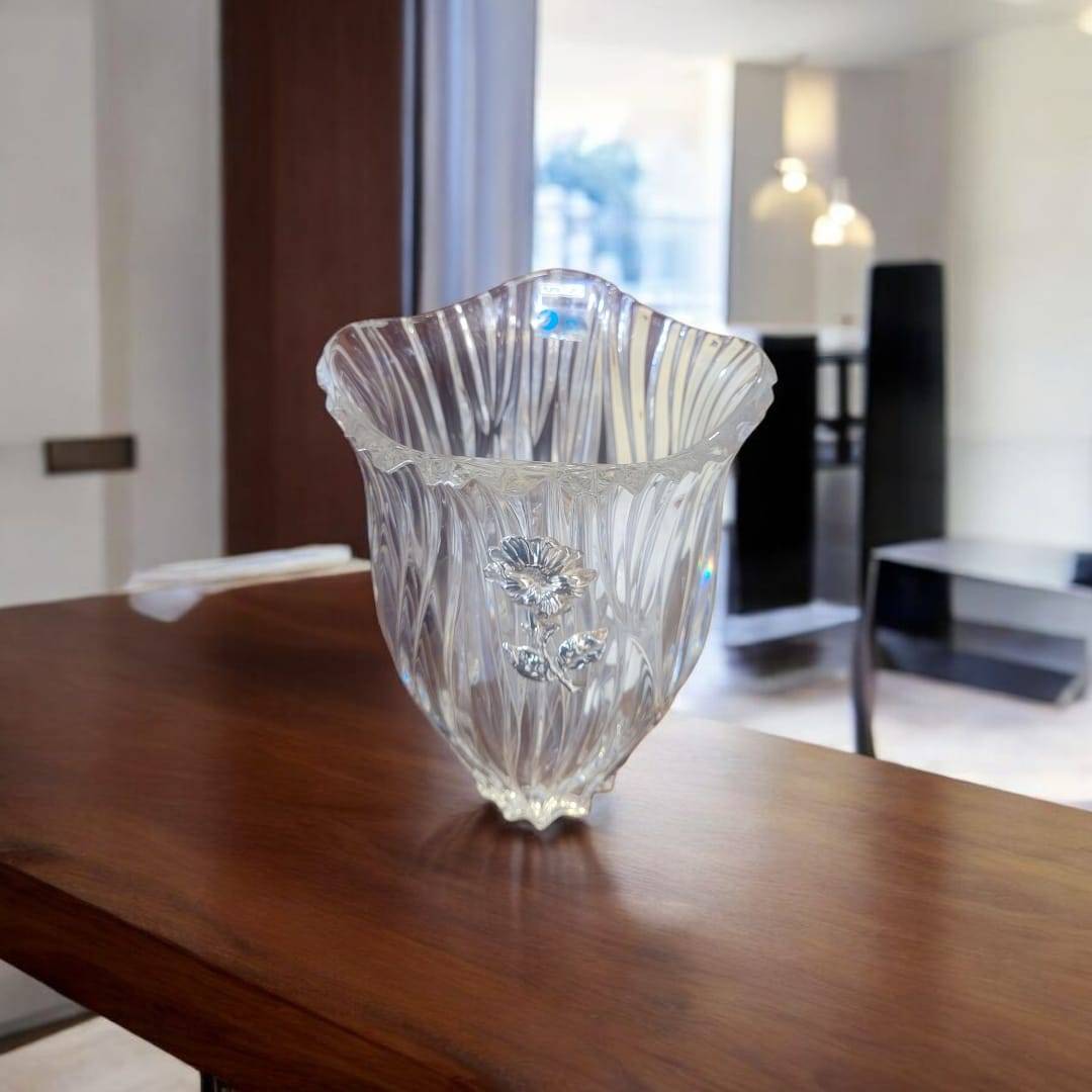 Haz tuyo este espectacular jarrón de cristal tallado DARO con flor de plata de ley. Una pieza sofisticada, resistente y artística para destacar en cualquier ambiente.