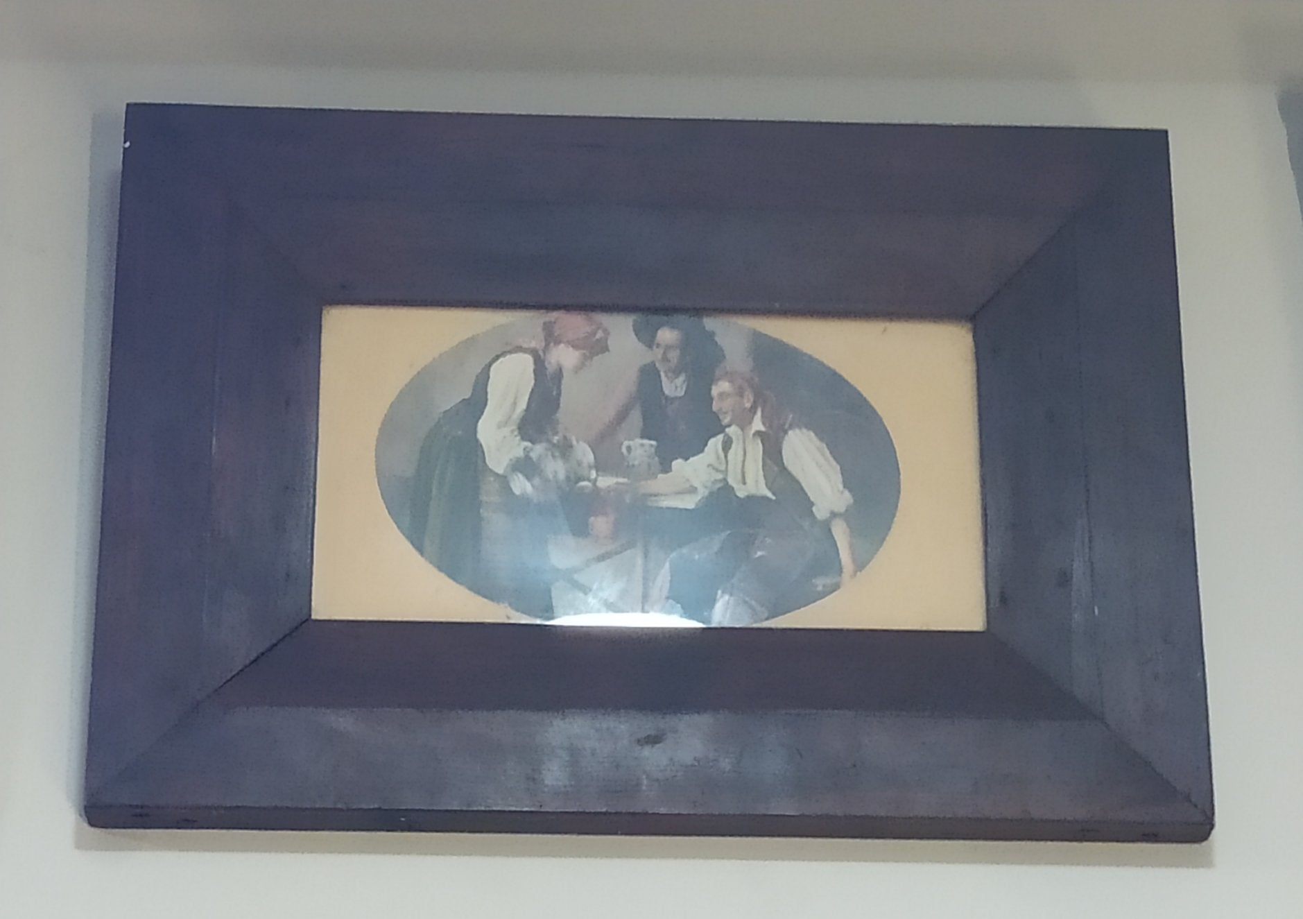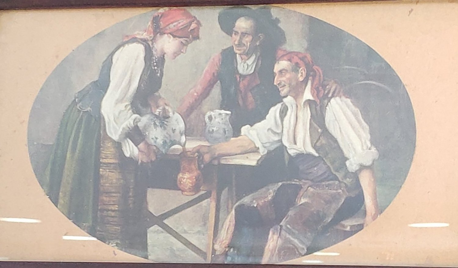 Esta lamina antigua con marco de caoba representa una escena costumbrista europea, donde dos hombres sentados y una mujer de pie entregando una jarra evocan la vida cotidiana del siglo XIX o principios del XX.