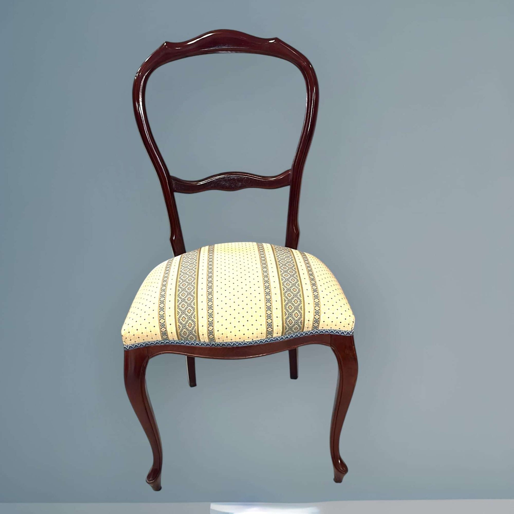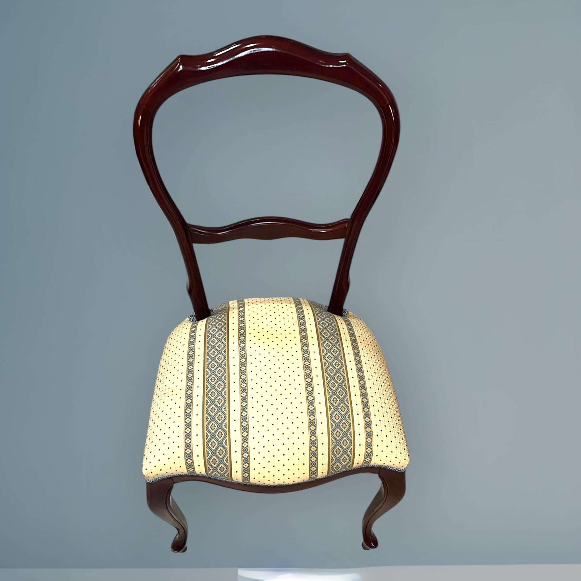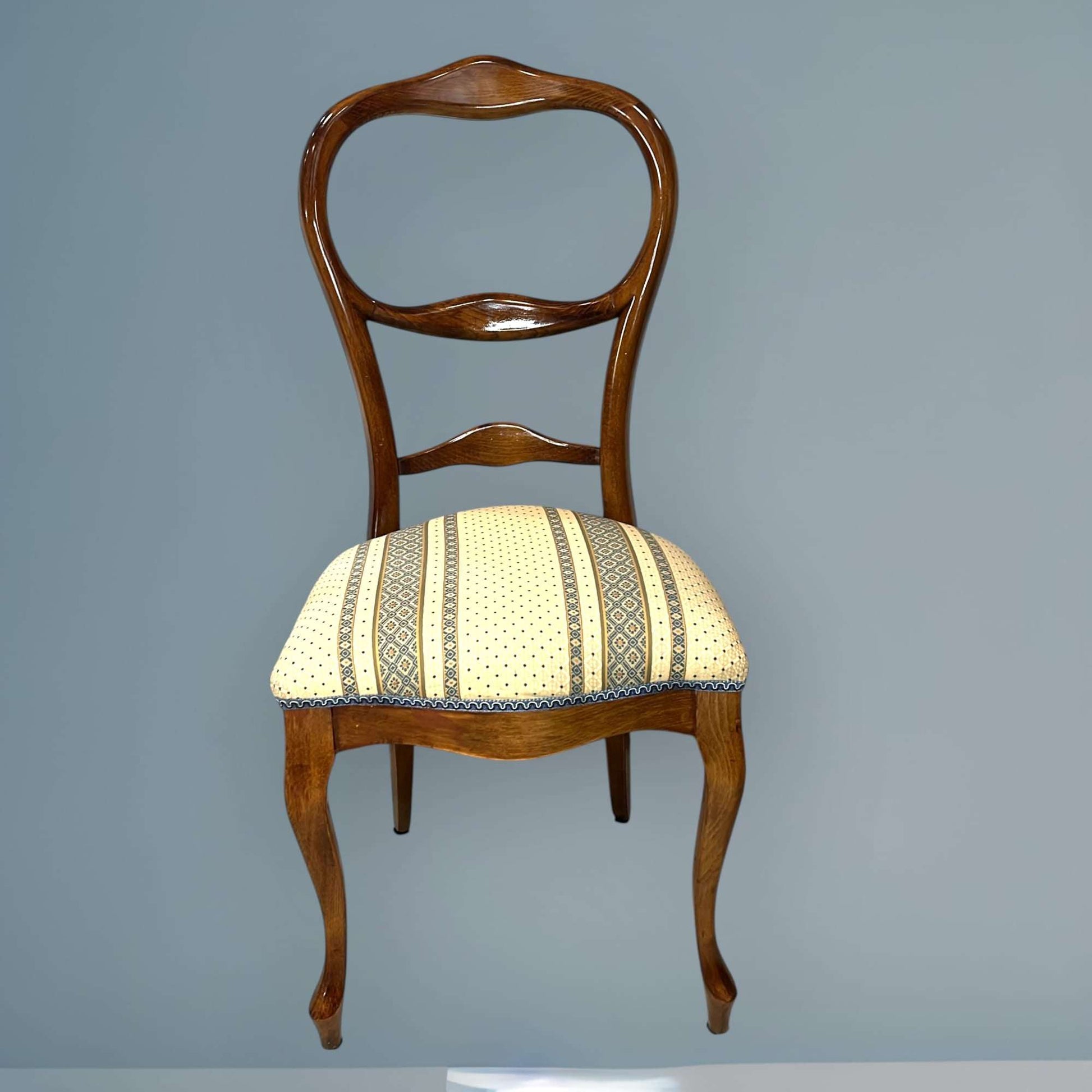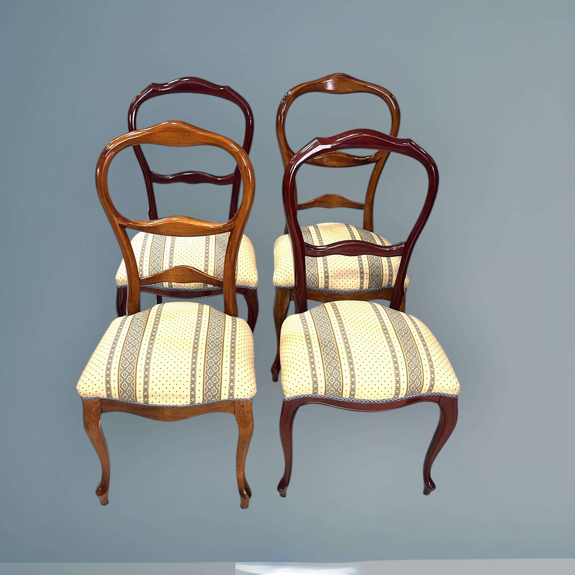 El contraste entre la madera pulida y el tapizado claro aporta luz y equilibrio visual, convirtiendo cada silla en una pieza armónica y exclusiva. Este Lote de 4 sillas clásicas de madera con asiento tapizado es ideal tanto para mesas de comedor antiguas como para combinar con propuestas más contemporáneas, logrando un efecto decorativo único y mejorado.