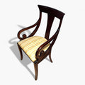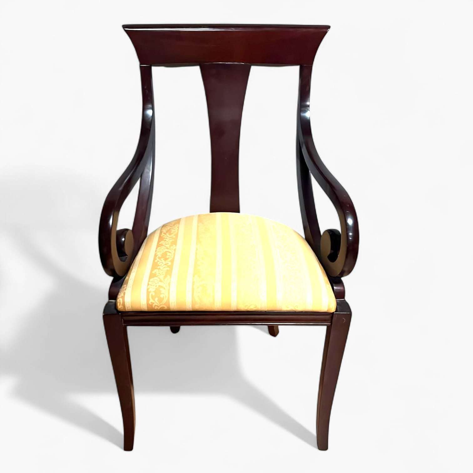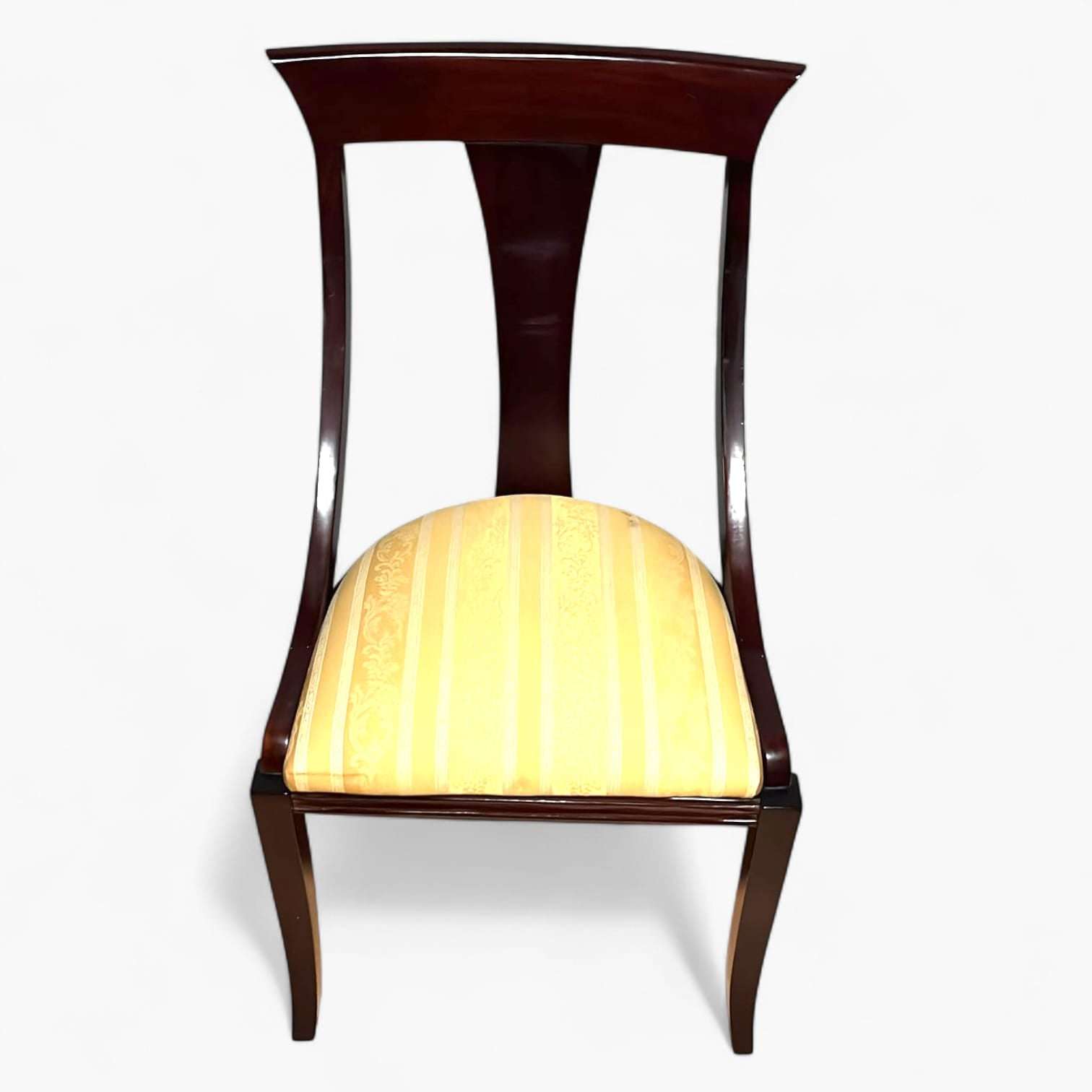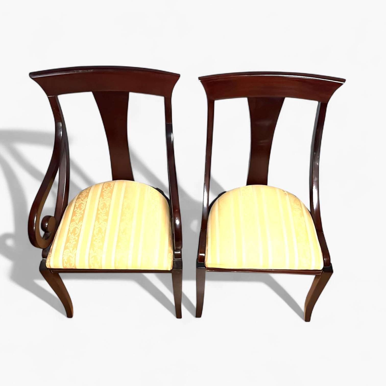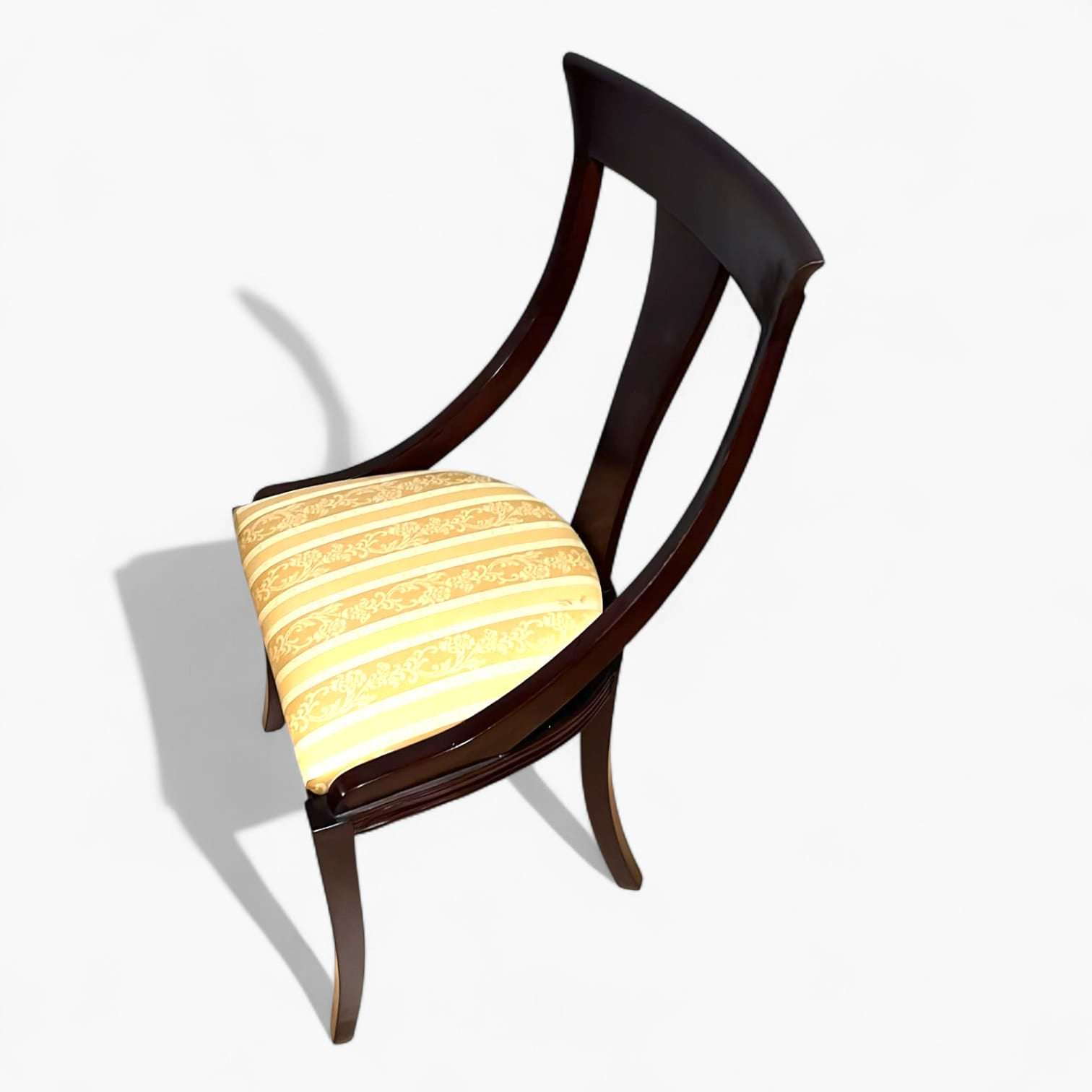 Las patas delanteras son ligeramente curvadas, mientras que las traseras prolongan la línea del respaldo, un rasgo típico del mobiliario clásico de calidad. Los asientos están tapizados, acolchados y bien proporcionados, pensados para un uso cómodo incluso en largas sobremesas.