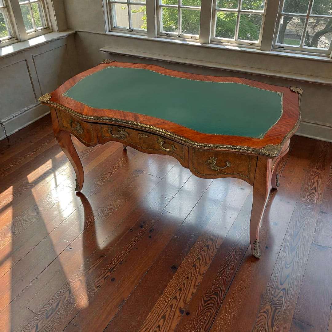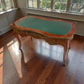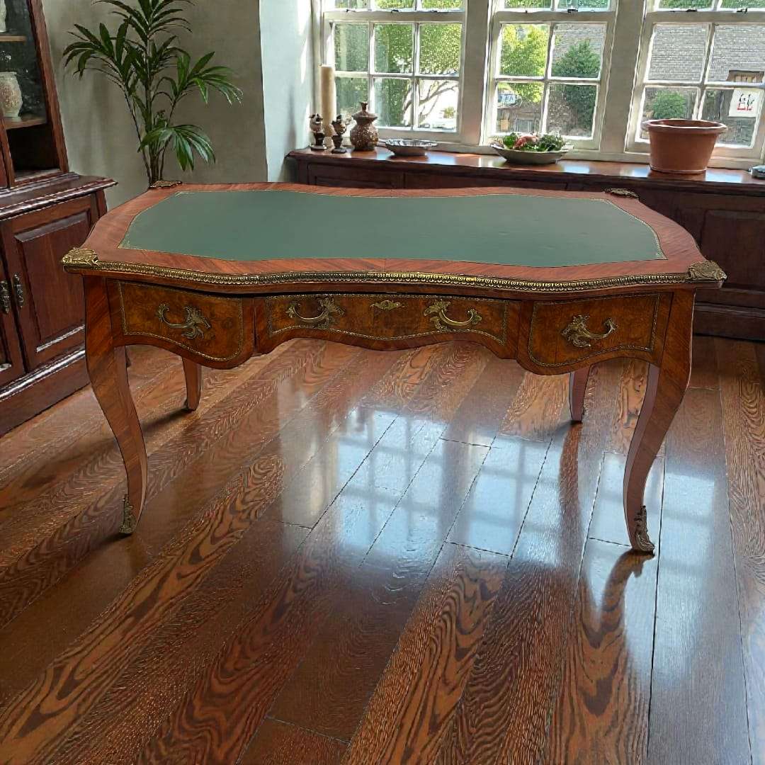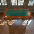 Superficie central tapizada en cuero verde con fileteado dorado decorativo, ideal para escritura.