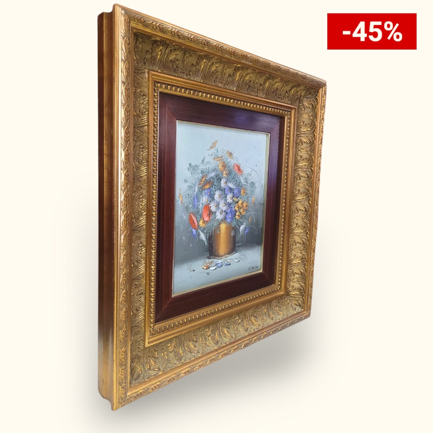 Óleo sobre lienzo con un jarrón de flores en marco dorado