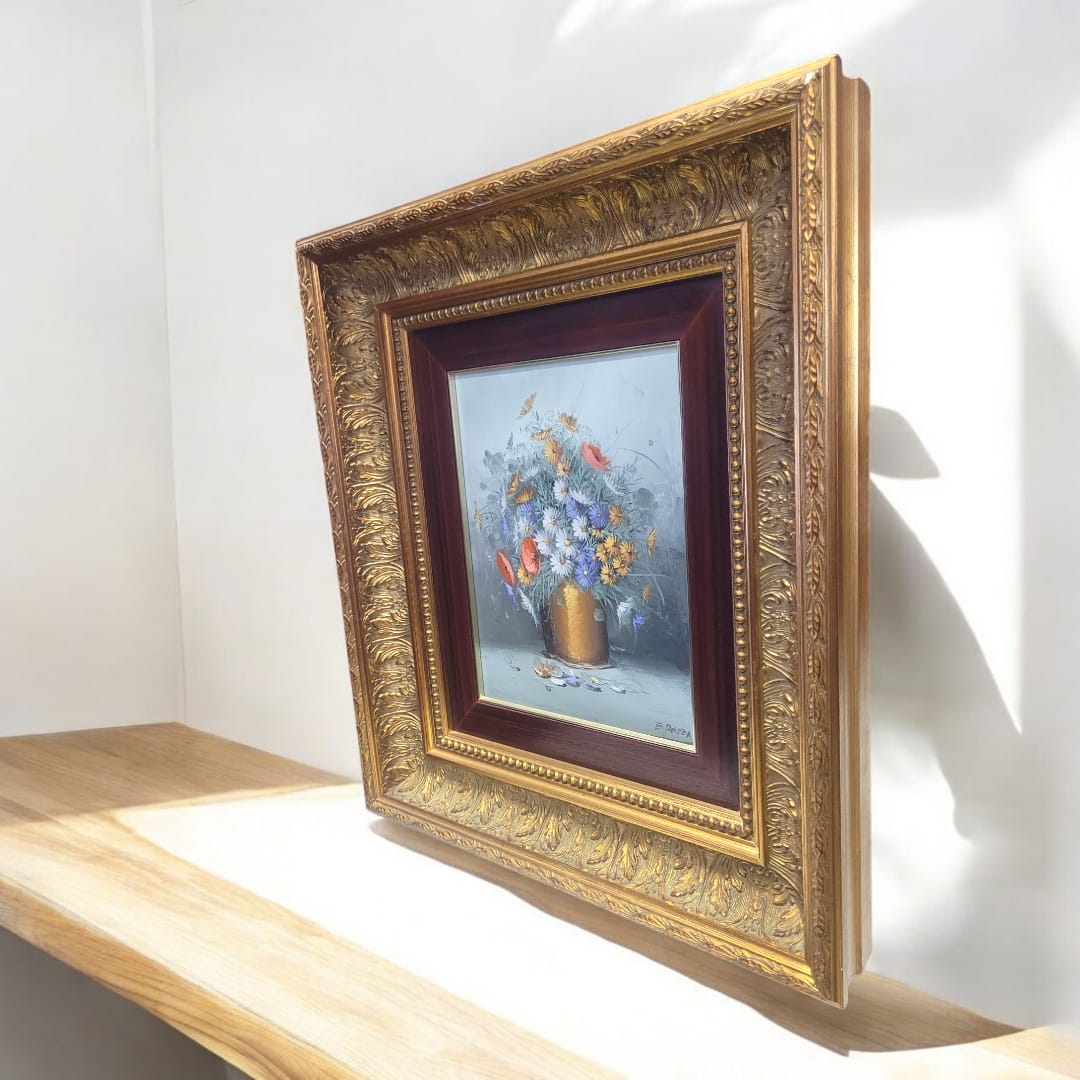 Añade encanto y sofisticación a tu espacio con este hermoso óleo sobre lienzo con un jarrón de flores, cuidadosamente pintado a mano. Su elegante composición y colores vibrantes crean una pieza artística ideal para cualquier habitación o ambiente. Este cuadro no es solo una obra decorativa, es una pieza artística única que destacará en tu colección por su elegante marco dorado, tallado con finos detalles ornamentales.