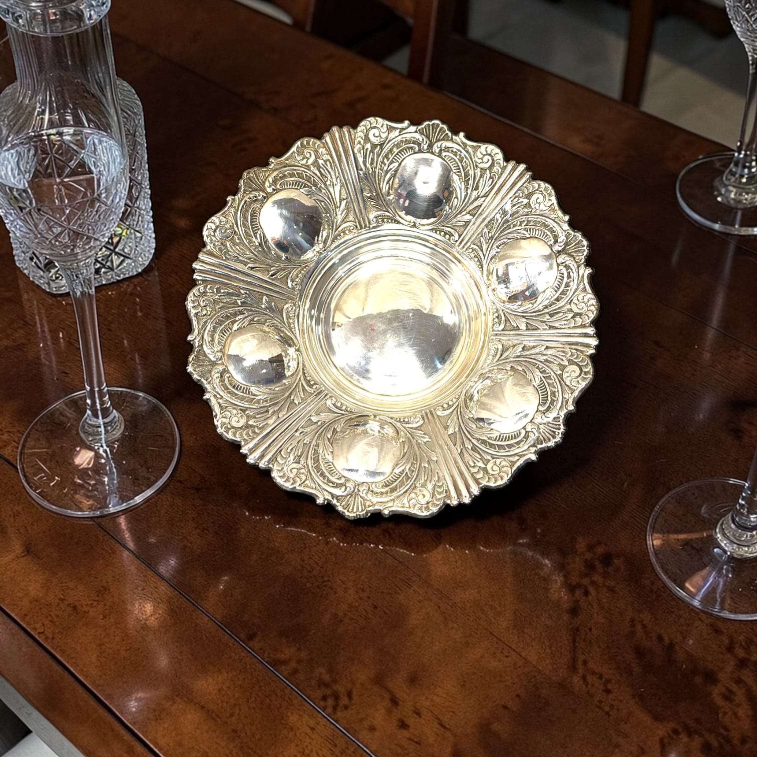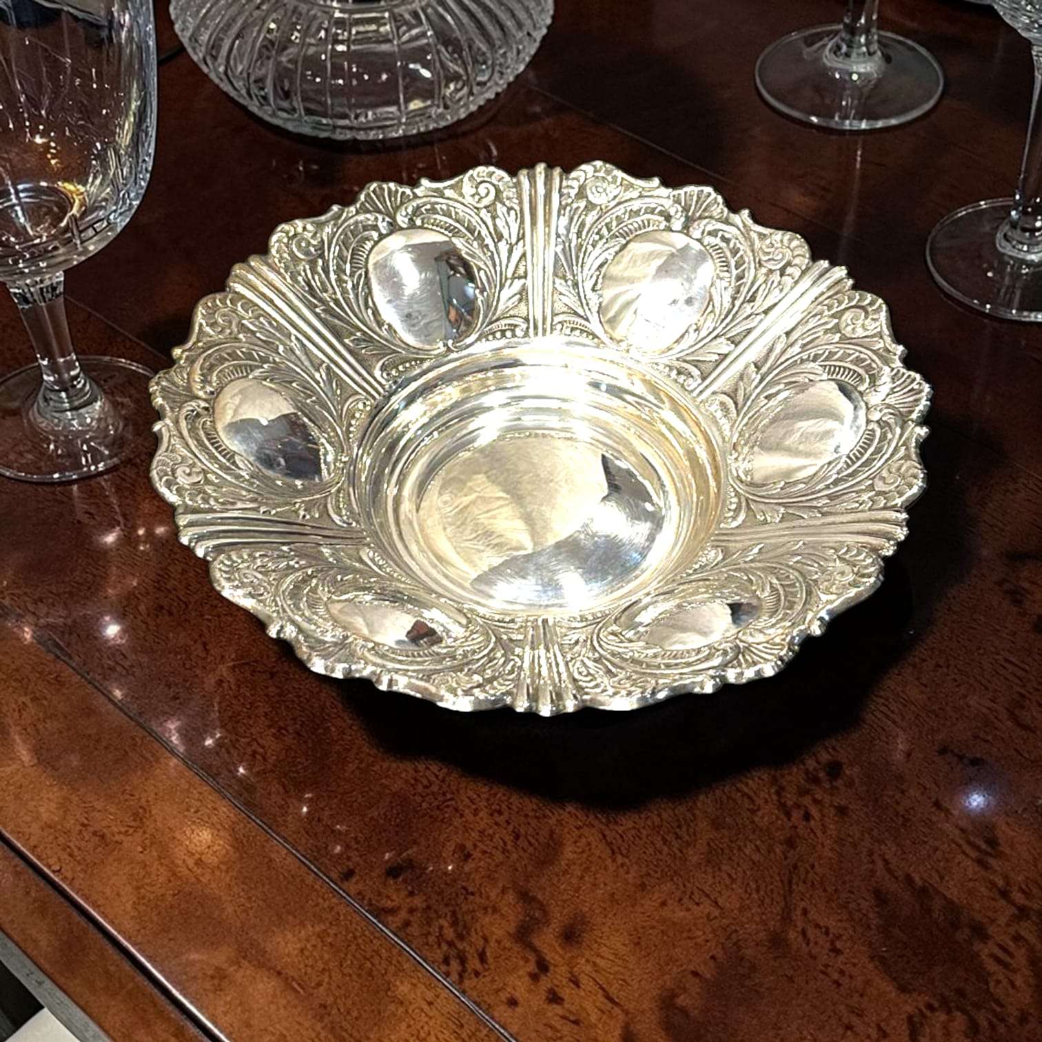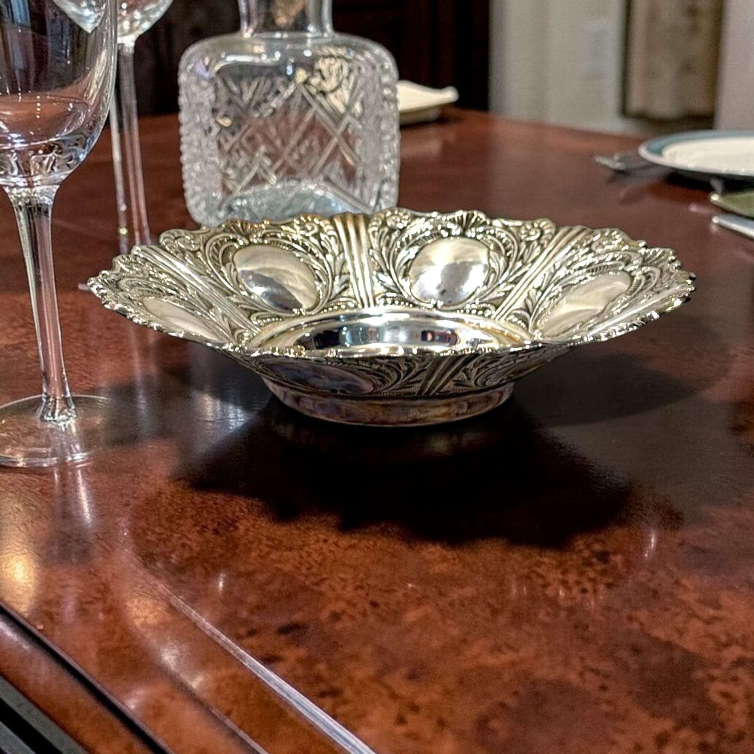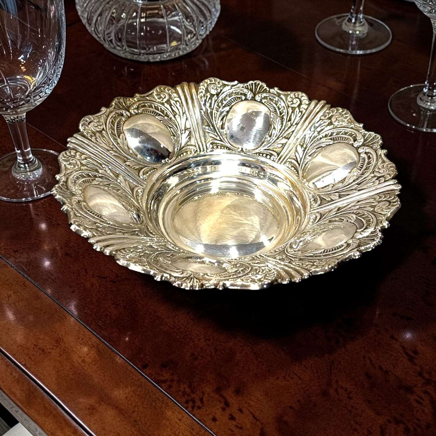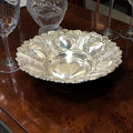 La Panera de metal plateado destaca por su equilibrio entre ornamentación y funcionalidad. La riqueza del repujado contrasta con el centro pulido, creando un juego visual refinado.