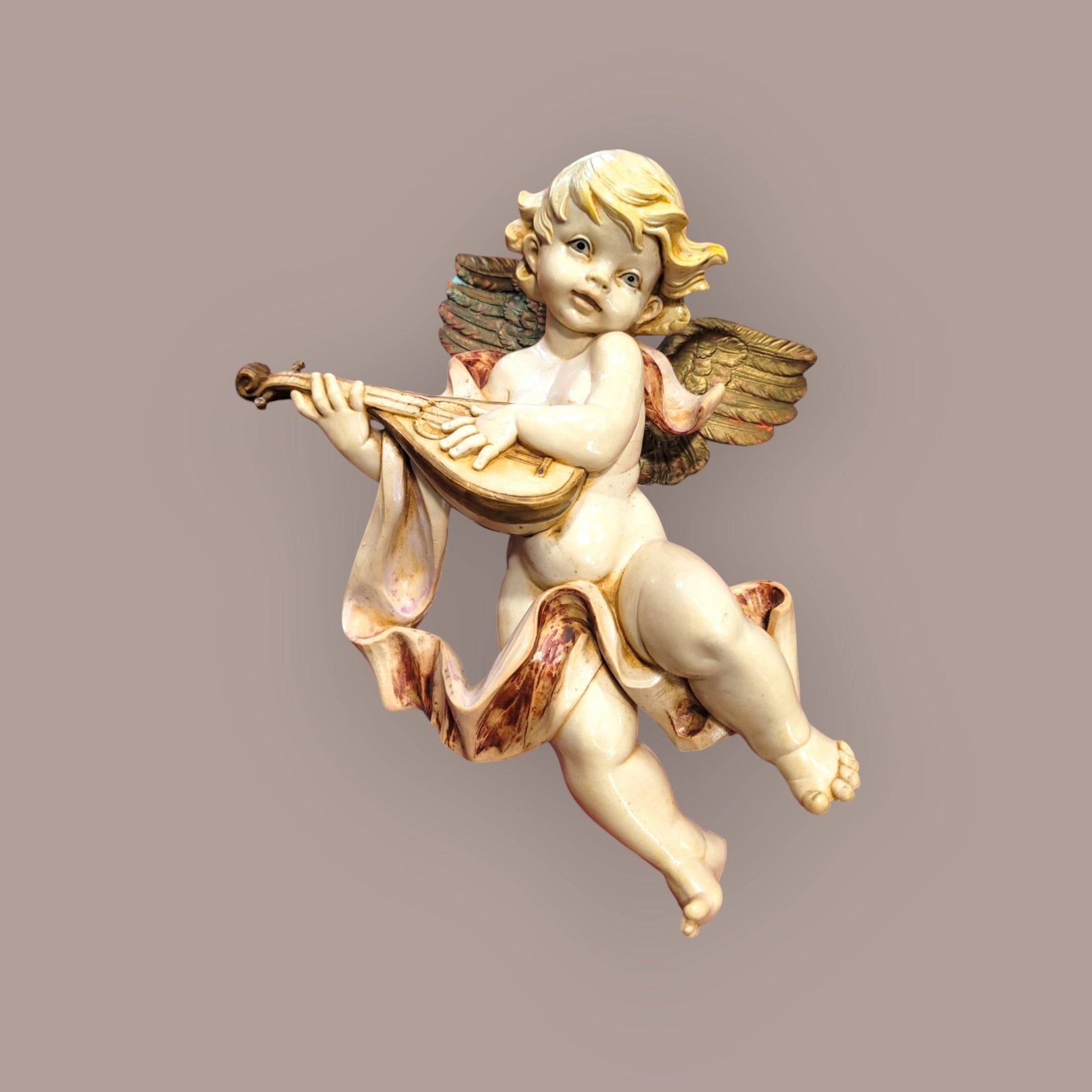 Descubre esta preciosa pareja de ángeles musicales, una obra maestra del afamado escultor Elio Simonetti, conocido como "el maestro de los belenes", quien trabajó durante décadas para la prestigiosa firma italiana Fontanini. Cada ángel está elaborado en resina pintada a mano, destacando por sus delicados detalles dorados y su espléndida expresión, evocando la espiritualidad y la tradición navideña. Estos ángeles, con instrumentos musicales en sus manos, son el reflejo de la refinada artesanía italiana de mediados del siglo XX, una pieza coleccionable que no solo embellecerá tu hogar, sino que también conectará con la herencia artística y religiosa del pasado.