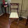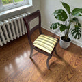 Asiento tapizado con tejido de rayas en tonos crema y verde, equilibrando sobriedad y distinción.