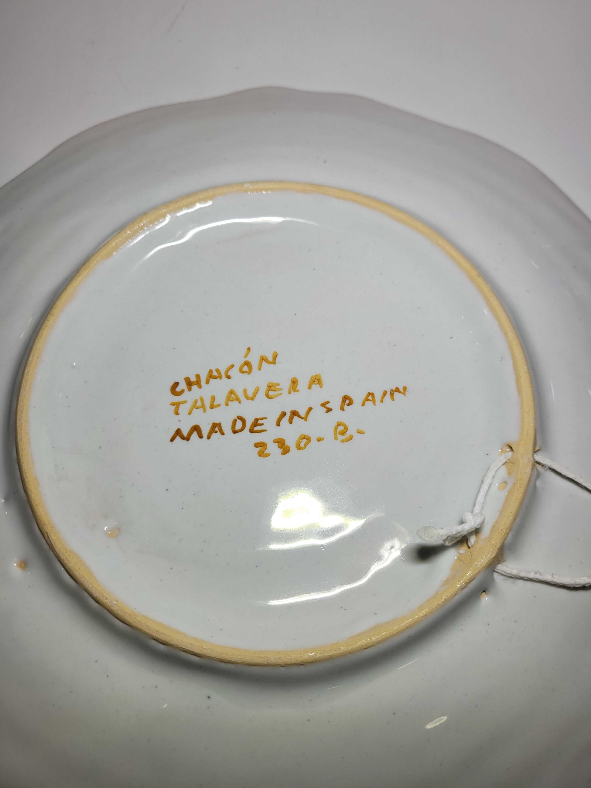 Este plato de cerámica de Talavera, fabricado por Chacón y pintado a mano, es una pieza decorativa excepcional. Perfecto para quienes valoran el arte tradicional español y buscan añadir un toque único a su hogar.