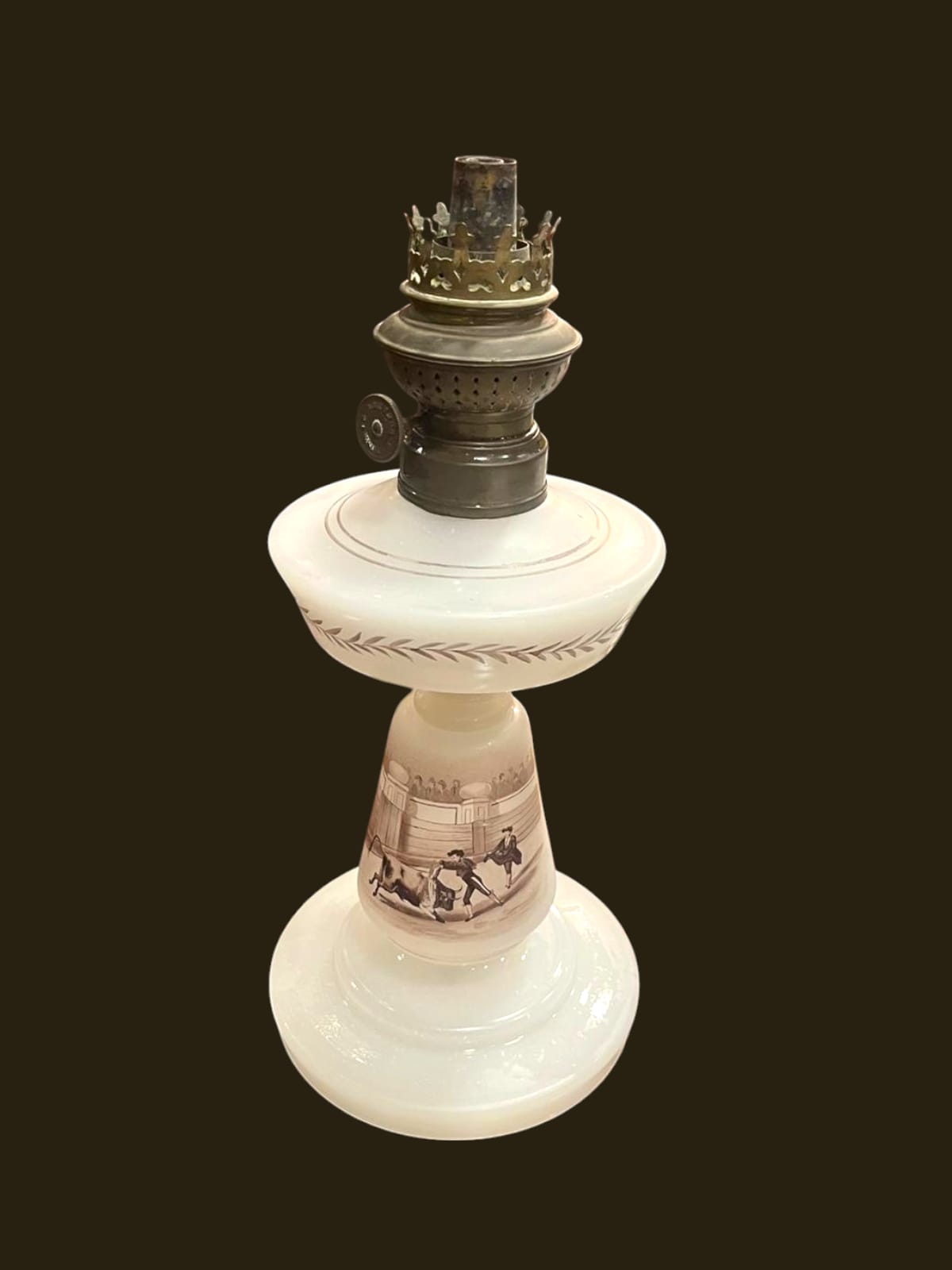 Este quinqué de opalina antigua es mucho más que una lámpara: es un homenaje a la tradición española, decorado con una escena de corrida de toros pintada a mano. El momento capturado muestra al torero en plena faena frente al toro, con detalles vibrantes que reflejan el dinamismo y la emoción de este arte. Hecho de vidrio de opalina, su acabado lechoso añade un toque de suavidad y sofisticación, perfecto para los amantes de las piezas decorativas con historia.