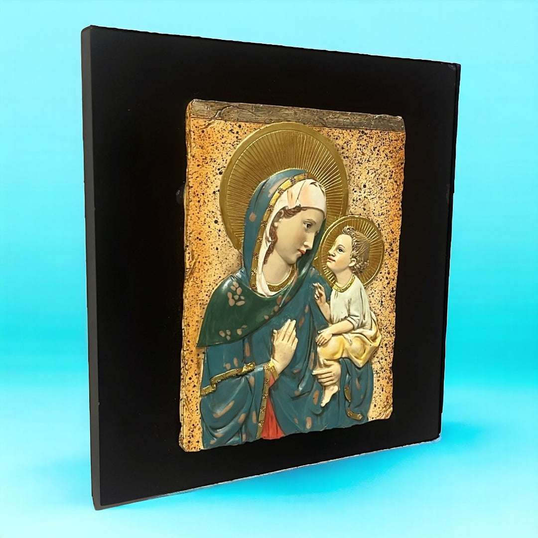 Relieve de la Virgen María y Jesús en resina, espiritualidad