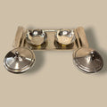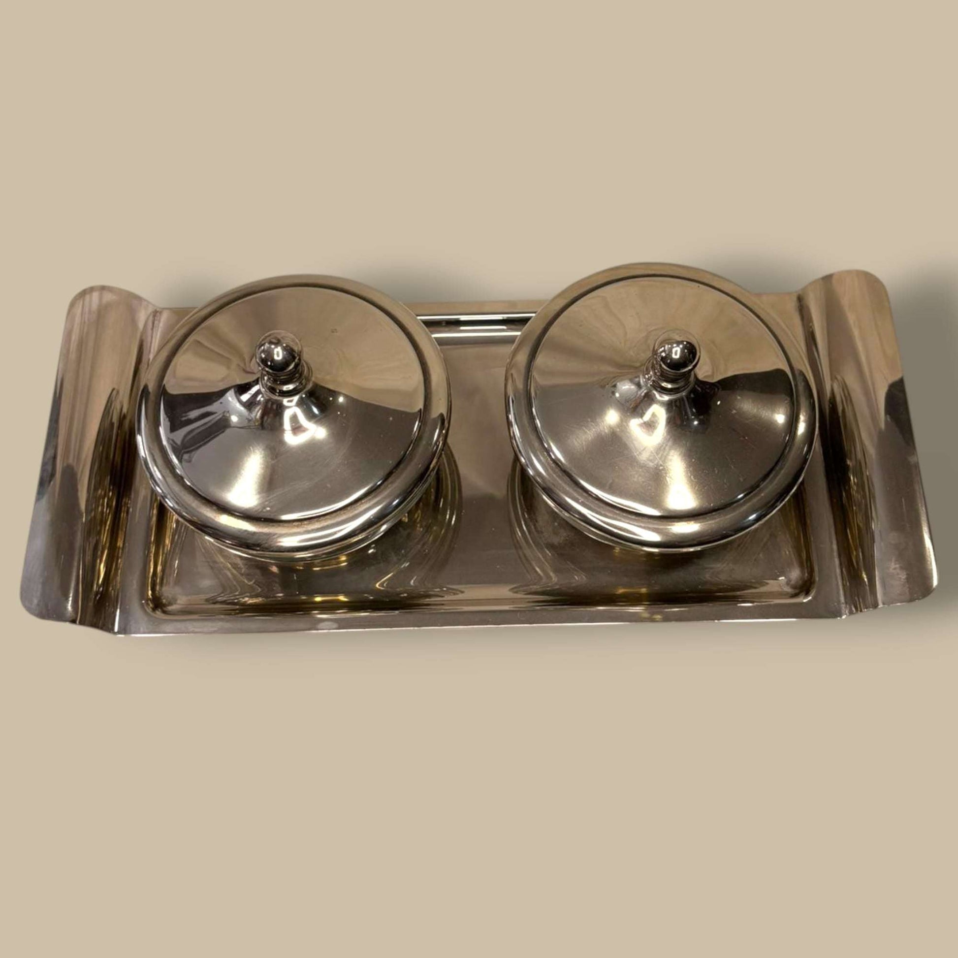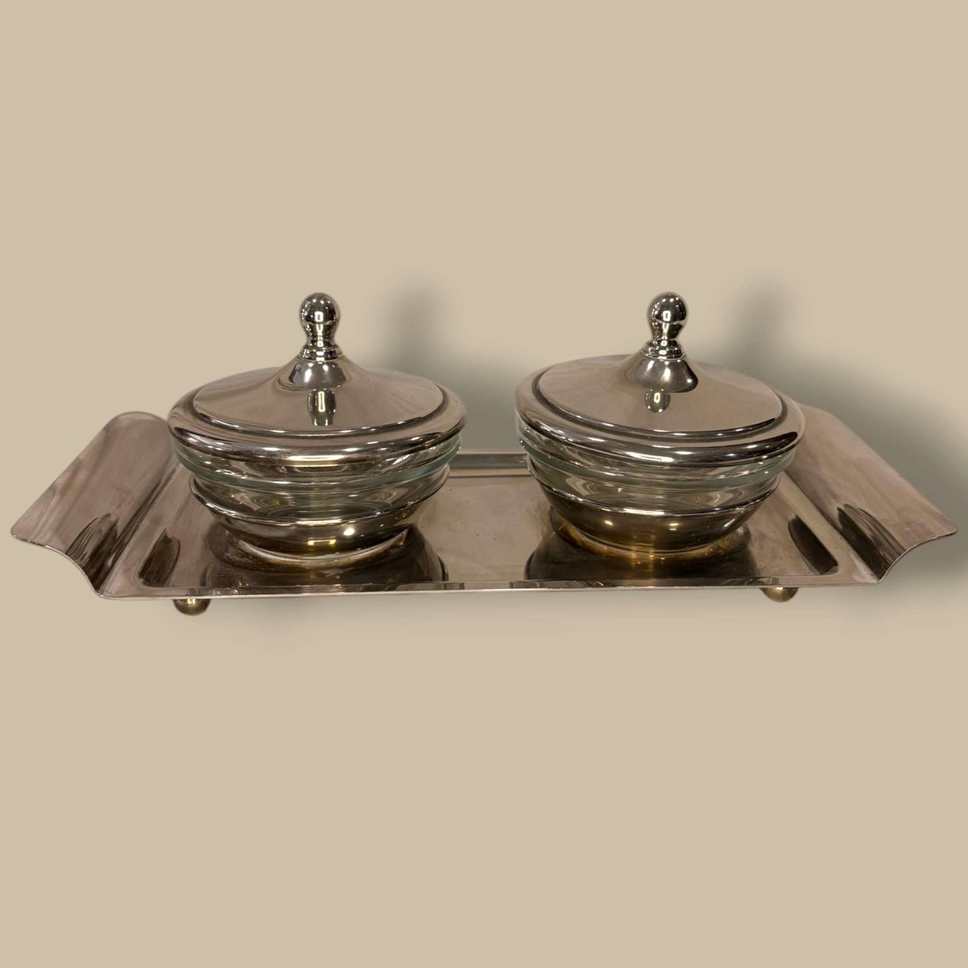 El Set de servicio está compuesto por una pareja de salseras con cuerpo de cristal transparente y tapas de metal plateado, acompañadas de su bandeja rectangular a juego. Diseñado para presentar salsas, aliños, cremas, mermeladas o acompañamientos con una estética refinada y armónica.