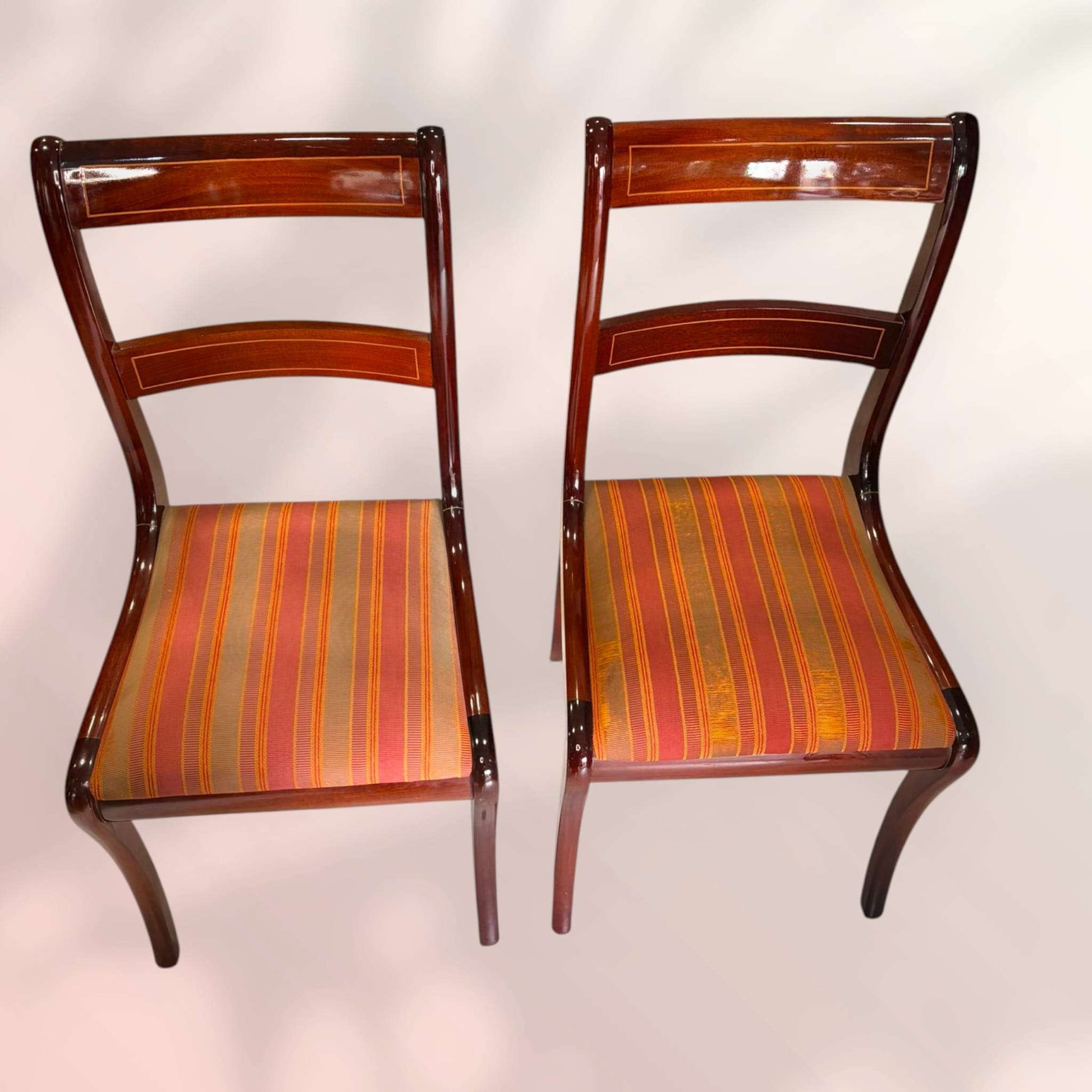 En las imágenes se aprecia un conjunto de cuatro sillas con una silueta estilizada, respaldo abierto con dos travesaños horizontales curvos, estructura en caoba de tono cálido y brillante y delicadas líneas de taracea que enmarcan los paneles del respaldo. El asiento presenta un tapizado listado en tonos coral, dorado y beige, muy decorativo y con una imagen cálida y clásica. Algunas piezas muestran desgaste en el tejido, algo coherente con su uso y con su carácter antiguo, y que puede asumirse como parte de su autenticidad o bien como oportunidad para un retapizado a medida.