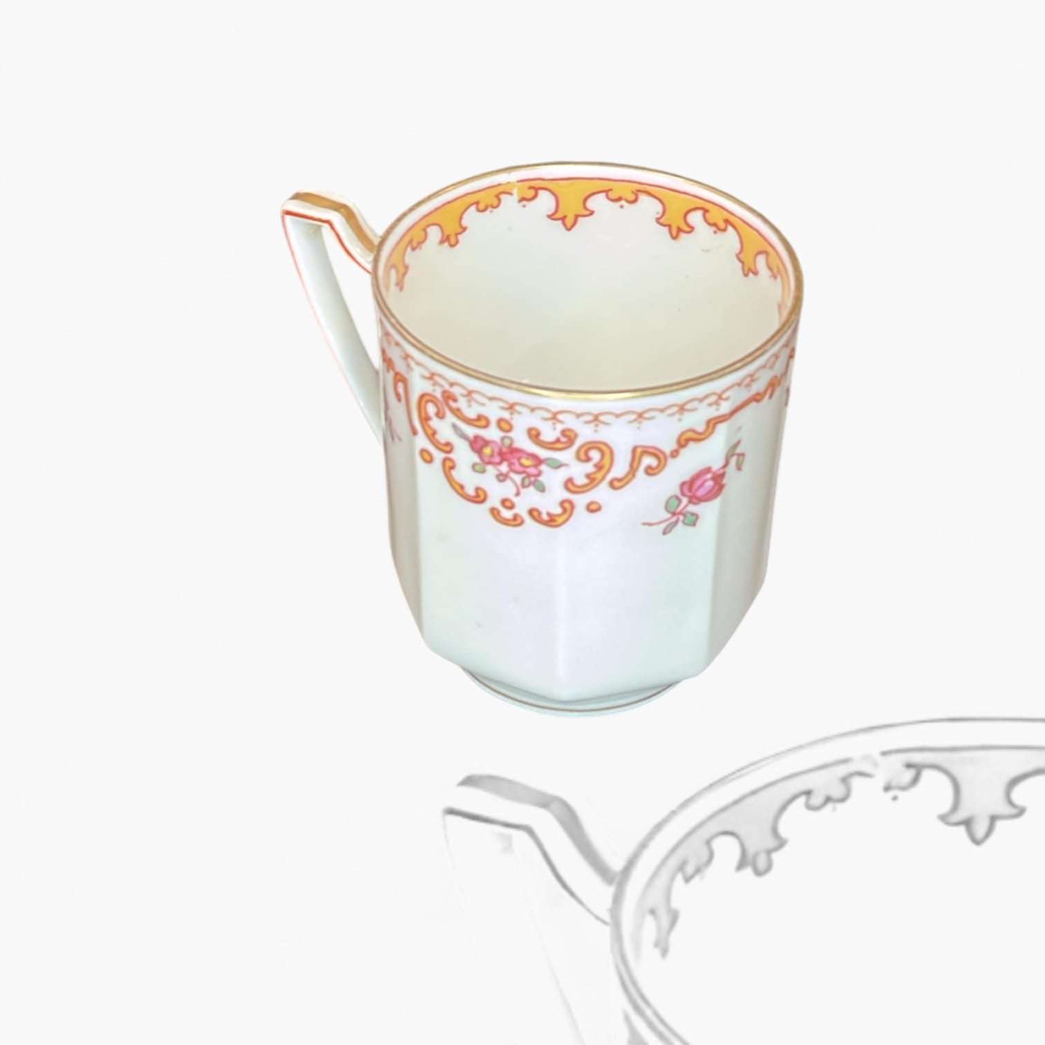 Fabricada en porcelana fina de Limoges, presenta una elegante forma facetada, poco común, que realza su valor artesanal. El cuerpo está decorado con motivos florales policromados, delicados roleos clásicos y filetes dorados aplicados a mano, visibles tanto en el borde superior como en el asa, lo que confirma su origen tradicional y su cuidada ejecución.