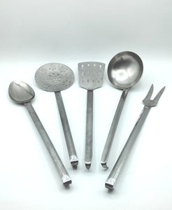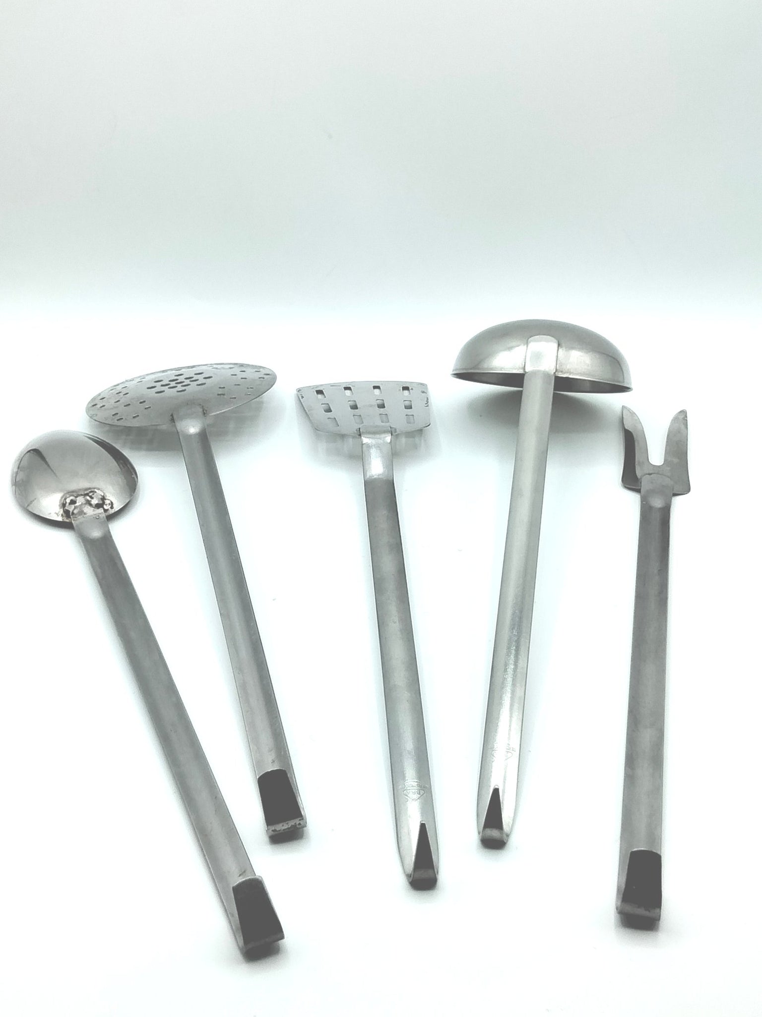 Este set incluye piezas esenciales para cualquier cocinero o aficionado: cucharones, espátulas, tenedores y más, cada uno con el encanto de lo antiguo pero con la seguridad y resistencia del acero inox nuevo. Su estilo retro no solo realza la estética de tu cocina, sino que además añade un elemento de conversación y admiración entre tus invitados.