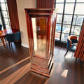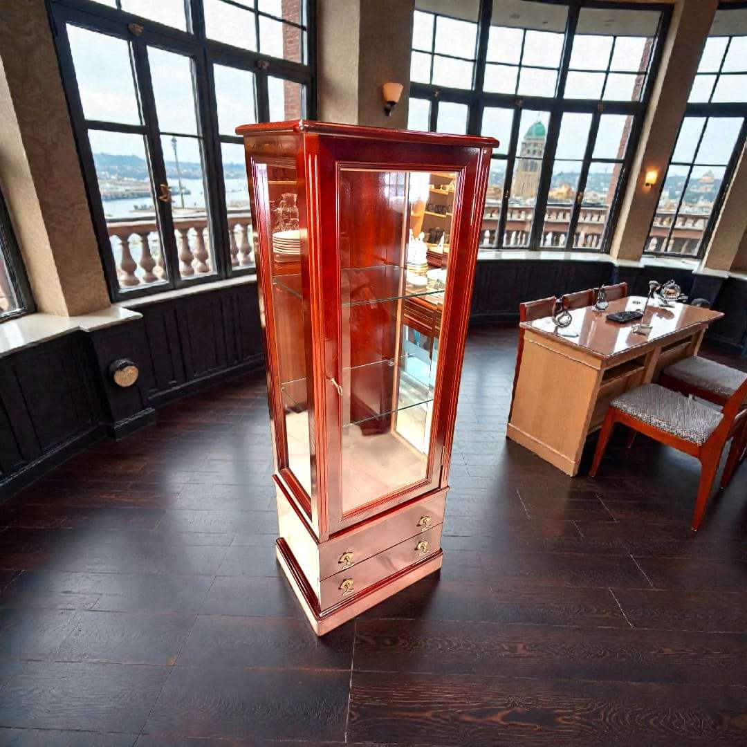 La VITRINA DE CAOBA Y CRISTAL no solo es un mueble decorativo, es una solución funcional para mantener ordenadas y protegidas tus piezas más valiosas. Su diseño vertical optimiza el espacio sin renunciar a la elegancia.