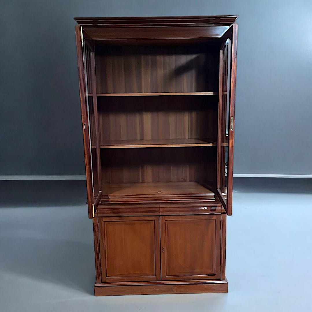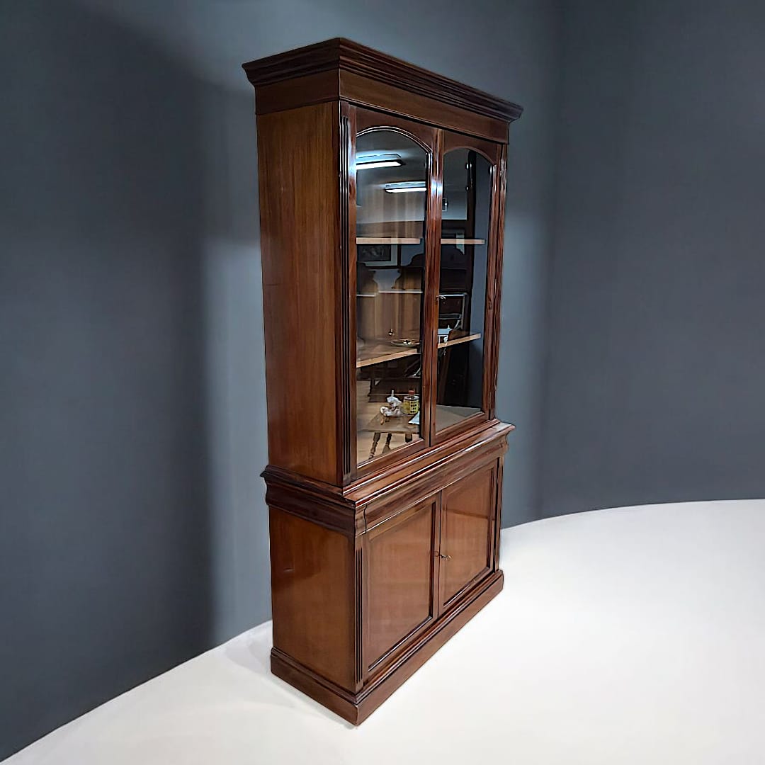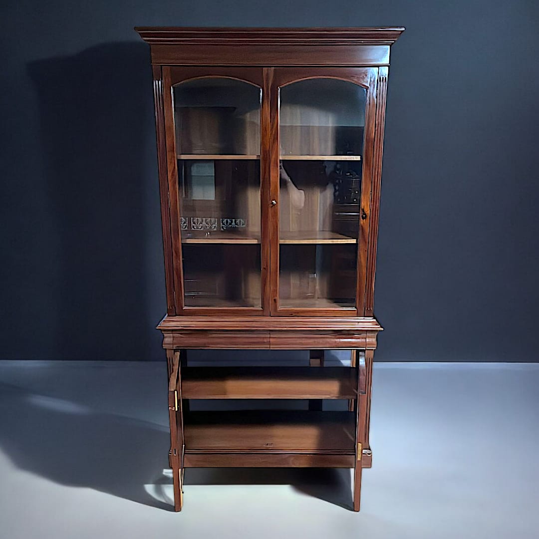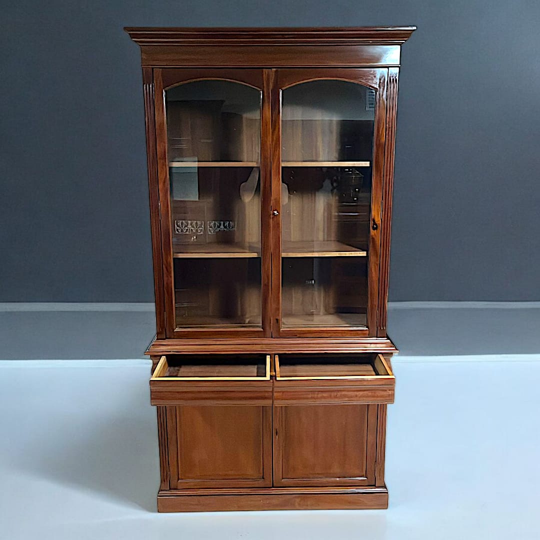 Esta vitrina de madera con puertas de cristal cuenta además con dos cajones discretamente ocultos entre ambas secciones, perfectos para guardar manteles, cubiertos u objetos personales. Su diseño simétrico y remates sobrios la hacen ideal tanto para ambientes clásicos como para decoraciones contemporáneas con un toque cálido y refinado.